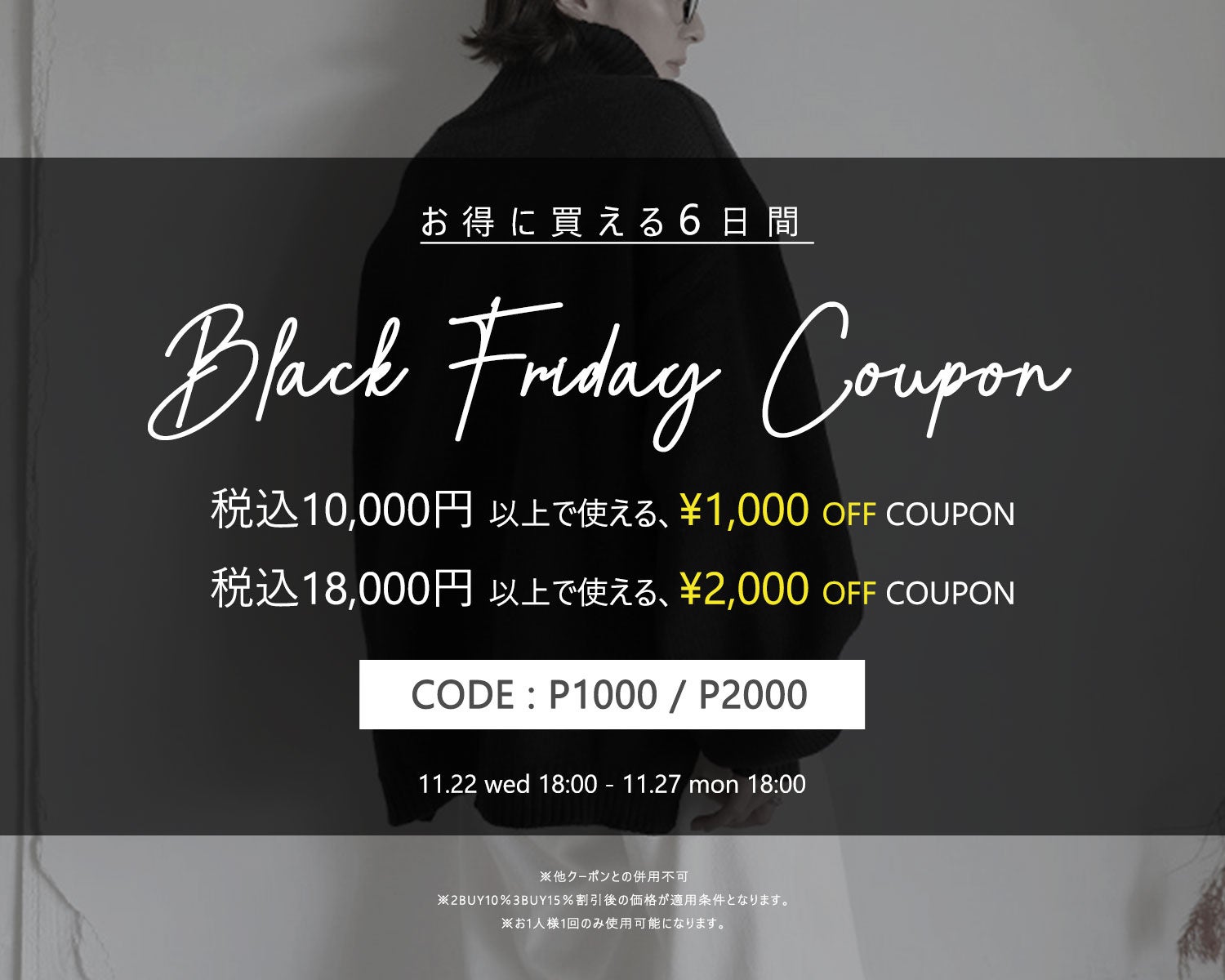 11/22(水)18:00~11/27(月)18:00までの期間中、税込10,000円以上お買い物していただいたお客様に1000円OFFクーポン、税込18,000円以上お買い物していただいたお客様には2000円OFFクーポンをプレゼントさせていただきます。