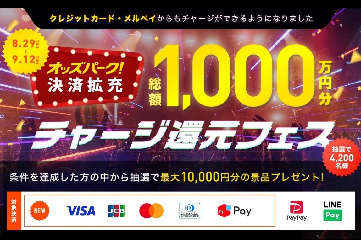 公営競技のインターネット投票サービスサイト「オッズパーク」(https://www.oddspark.com/)を運営するオッズ・パーク株式会社(本社:東京都中央区、代表取締役社長 兼 CEO:宮下 直之、以下当社)は、2024年8月23日(金)に新たな決済サービスとして「クレジットカード」※1と電子マネー決済「メルペイ」を導入いたしました。決済サービスの拡充に合わせて、2024年8月29日(木)より総額1,000万円分の「チャージ還元フェス」を開催いたします。