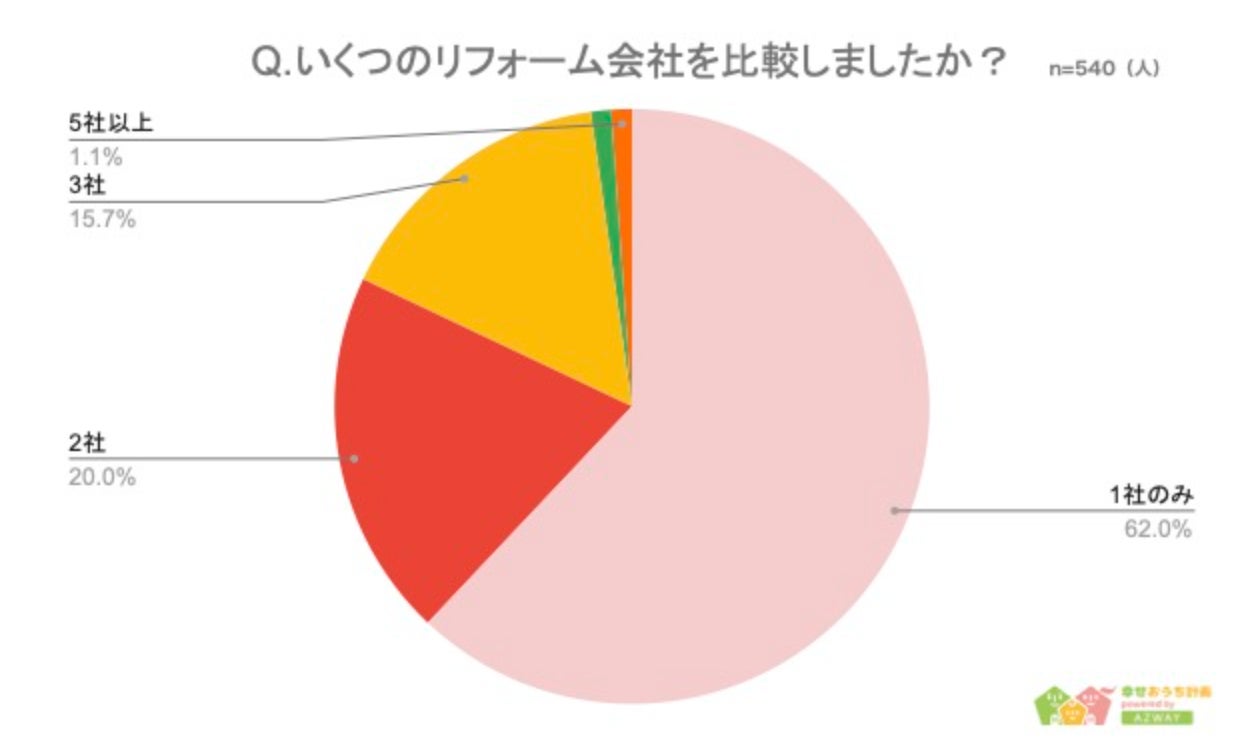 最後に、「リフォーム会社を選ぶ際の比較した数」について聞いたところ、1社のみが335人で62%、2社が108人で20%、3社が85人で15.7%という結果になりました。1社もしくは2社の比較でリフォーム会社を決めている人が8割以上いることがわかります。