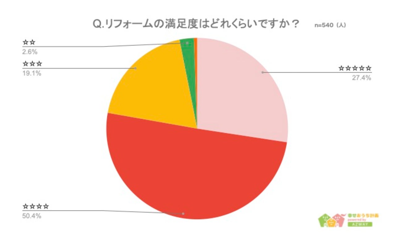 ・トイレのリフォームが最多、リフォームの満足度は星4つが約半数