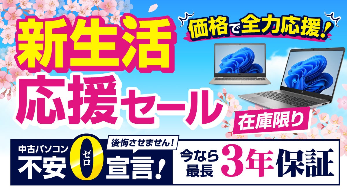 新生活の準備におすすめなモバイルパソコンや、ワード・エクセル搭載パソコンがお買い得に。ご好評につき、中古パソコン最長3年保証キャンペーンも継続決定しました。
