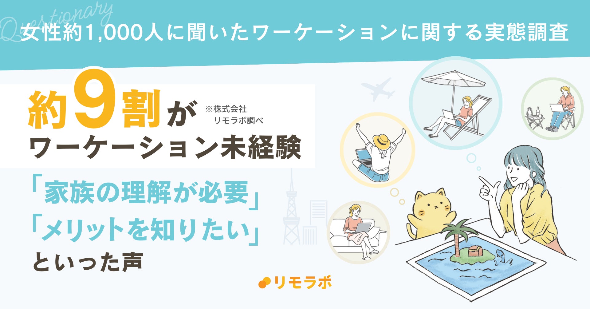 「女性のキャリアをシームレスに」の実現に向けて、個人向けリモートワーク実践スクール事業「リモラボ」を運営する株式会社リモラボ(東京都渋谷区、代表取締役 佐伯正邦、以下「当社」)は、ライフステージの変化に応じた働き方を支援するリモートワーク実践スクール「リモラボ」のメンバーである女性約1,000人を対象に、ワークスタイルの多様化が進む中で注目されている「ワーケーション」に関する実態調査を行いました。また、調査結果を踏まえ、実際にワーケーションを経験しているリモラボスタッフへもインタビューを実施。その魅力やより充実させるためのポイントを紹介します。