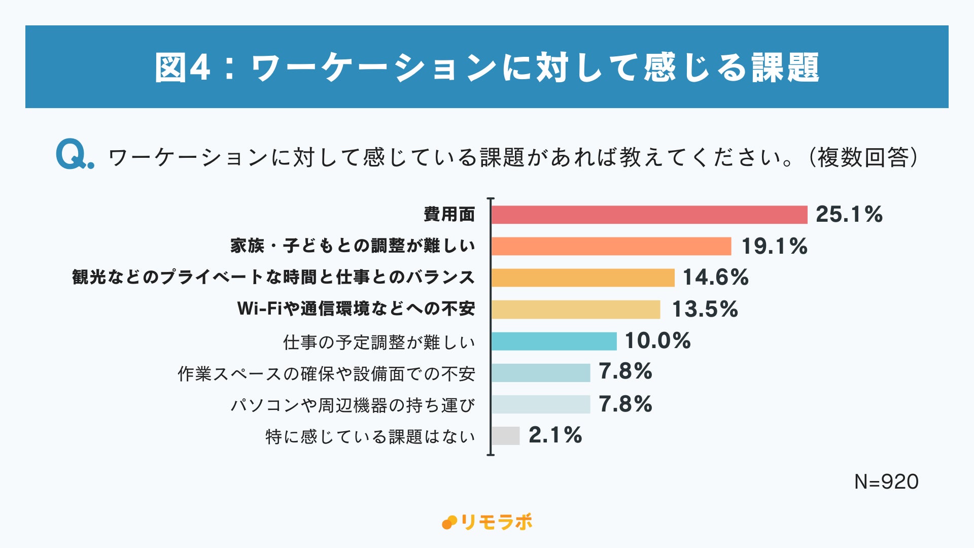 ワーケーションの課題として最も多かったのは「費用面(25.1%)」、次いで「家族・子どもとの調整(19.1%)」が2位に(図4)。また、「観光などのプライベートな時間と仕事とのバランス(14.6%)」や「Wi-Fiや通信環境などへの不安(13.5%)」も課題として挙げられました。