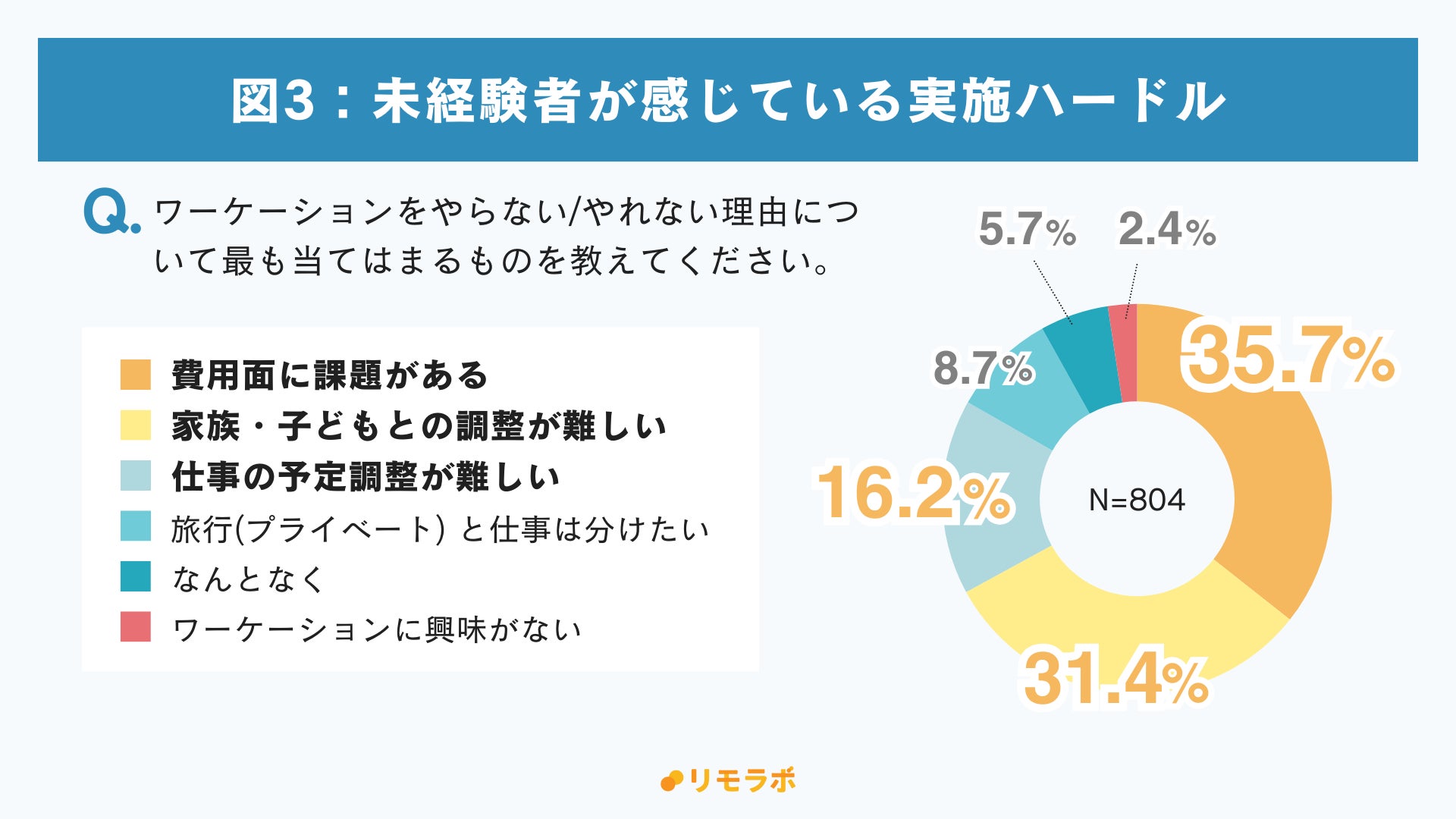 一方、未経験者は87.4%おり、主な未経験理由は「費用面(35.7%)」「家族・子どもとの調整(31.4%)」などがあげられる。