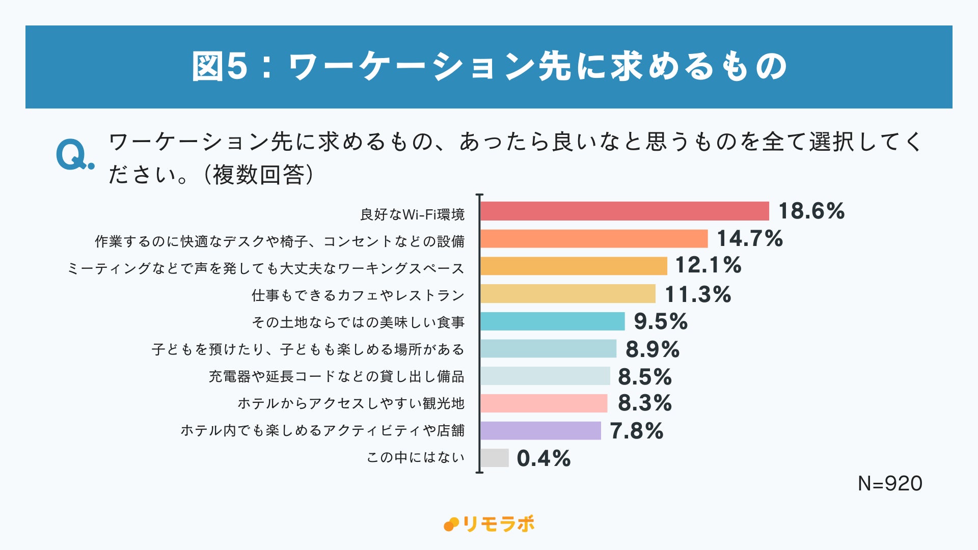 また、「ホテルからアクセスしやすい観光地(8.3%)」や「ホテル内で楽しめるアクティビティや店舗(7.8%)」など、仕事とプライベートのバランスを取るためのリフレッシュ環境も求められており、ワーケーションの場として、働きやすさとリラックスの両立が重視されていることがわかりました(図5)。