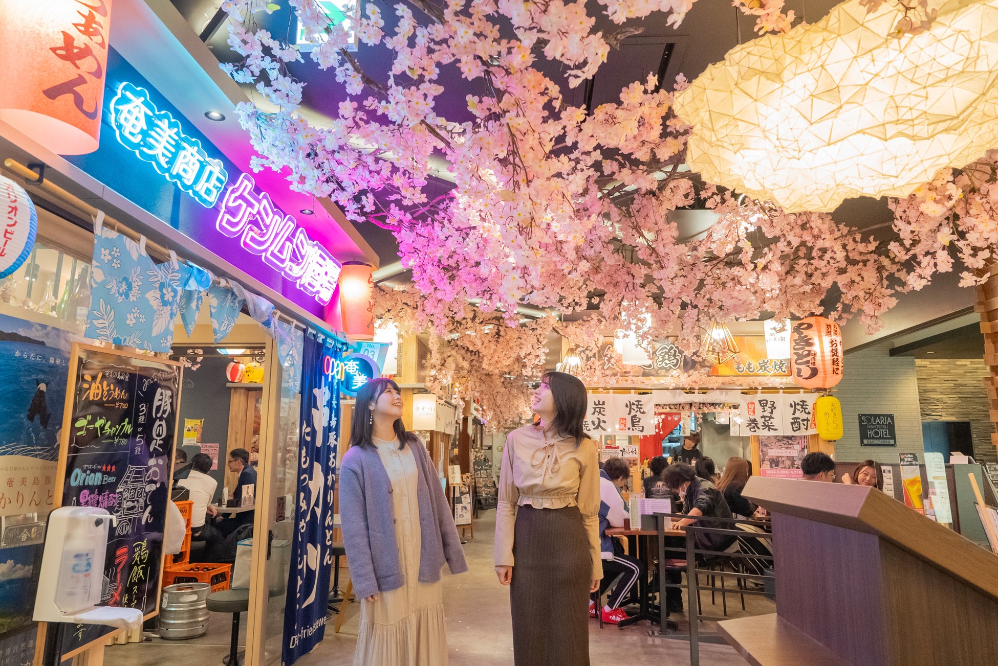 ・屋台村の天井に約10万輪の桜の花で装飾