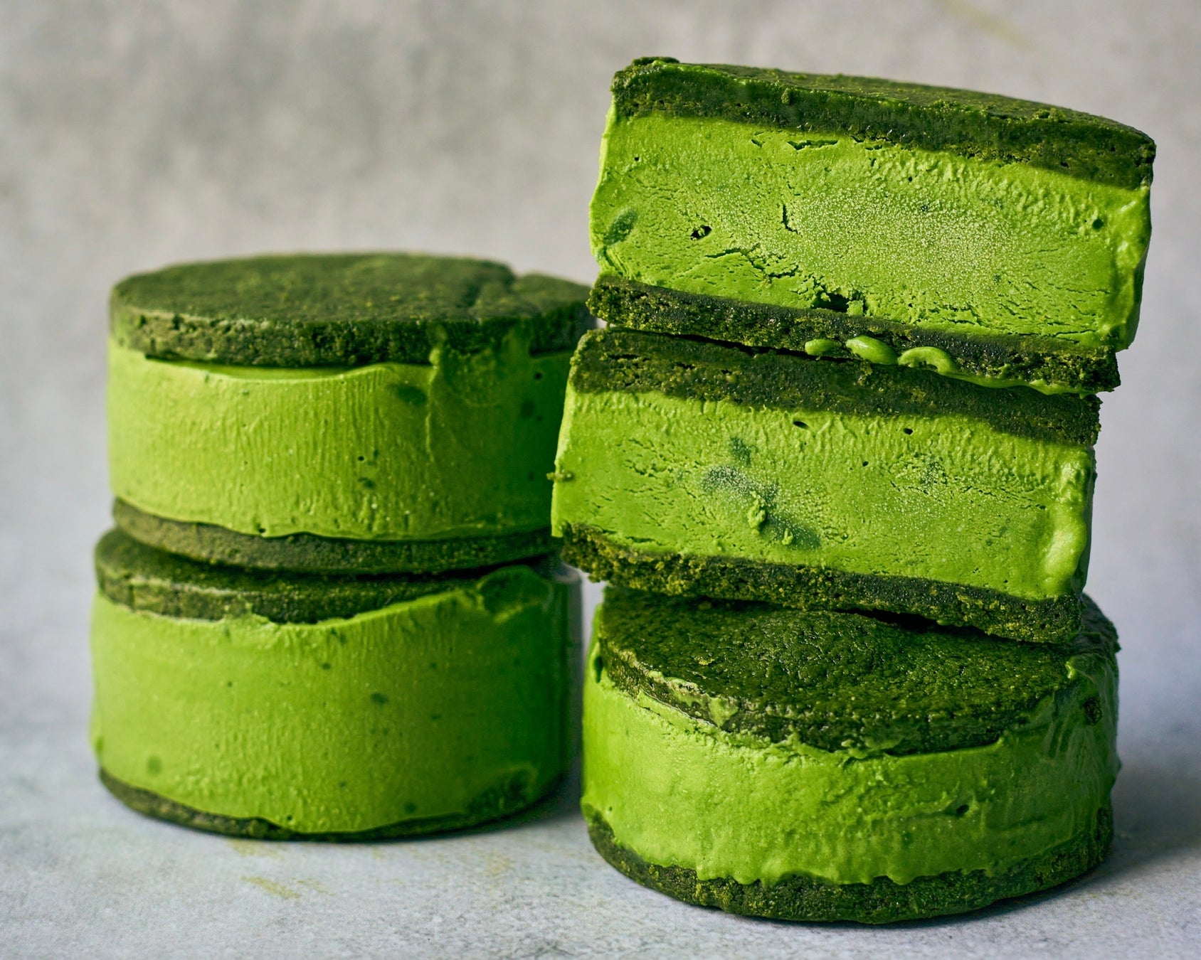 抹茶をふんだんに使用した自家製の抹茶クッキーで、濃厚な抹茶アイスを挟みました。
