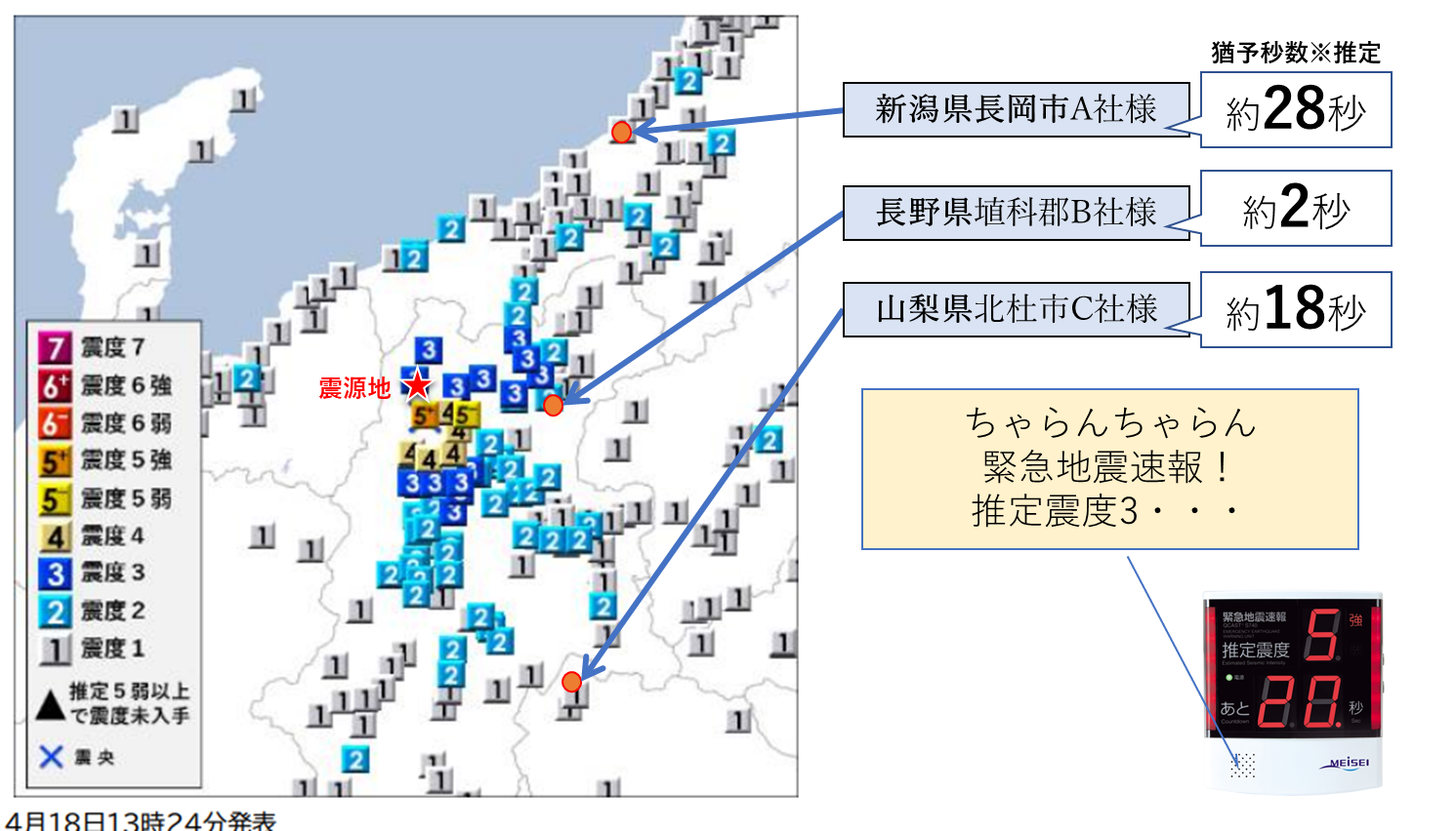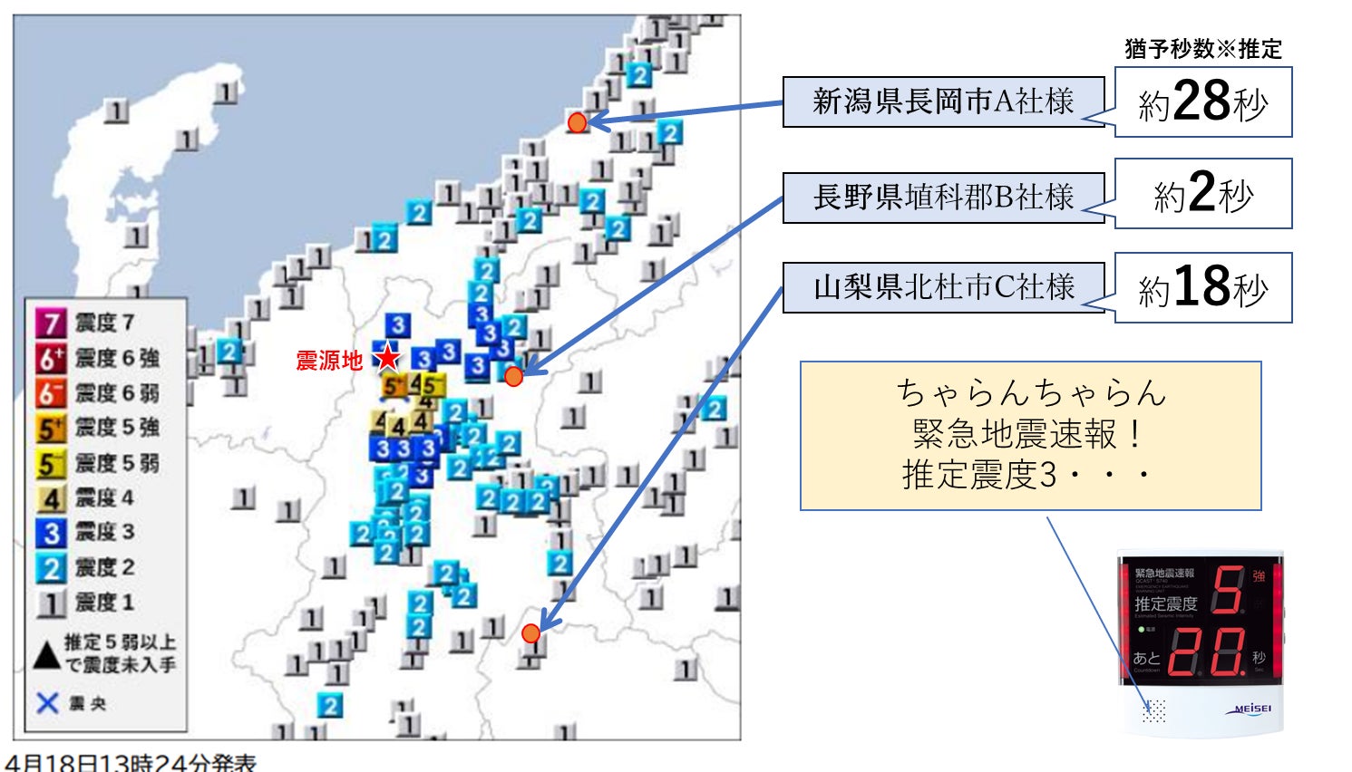 長野県北部を震源とする最大震度5強の地震(4月18日13:20頃発生)について、『ProP biz(プロップビズ)緊急地震速報配信サービス』の配信状況をお知らせいたします。