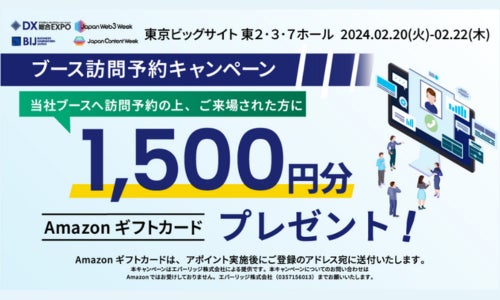 ブース訪問のご予約時にプロモーションコードをご入力いただいた上で、当日アポイントを実施させていただいた方にAmazonギフトカード(1,500円分)を会期後に展示会事務局から進呈いたします。