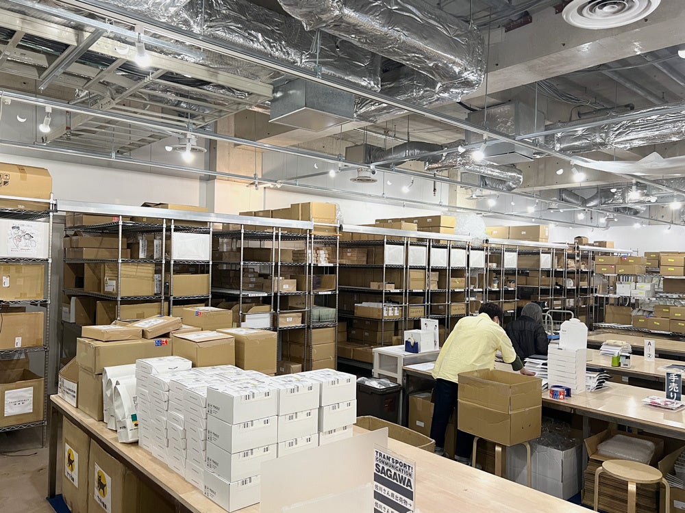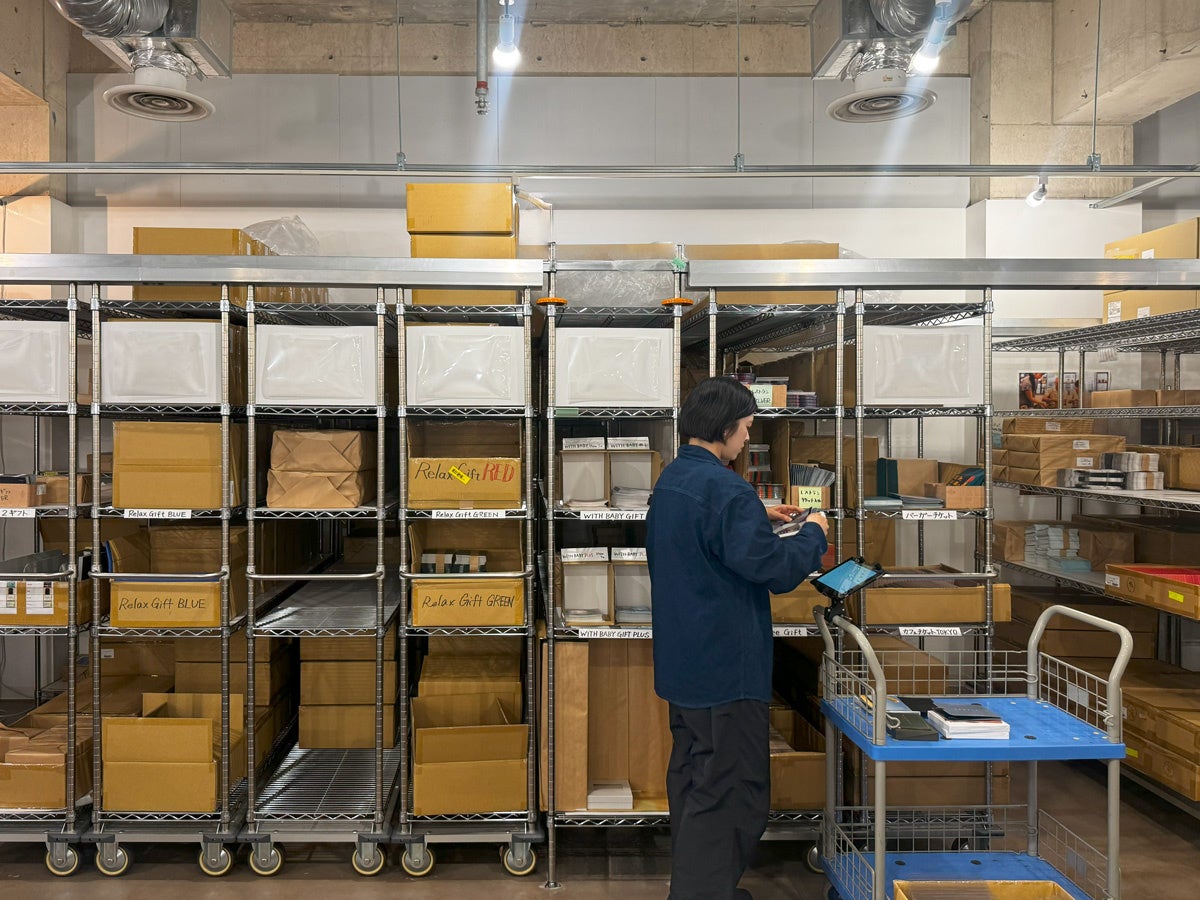 カタログの在庫管理からピッキング、梱包、発送の一連の流れは自社のオフィス内で完結。60種類の多岐にわたるカタログの管理にはエレクターの移動棚トップトラックシステムが一役を担っています。