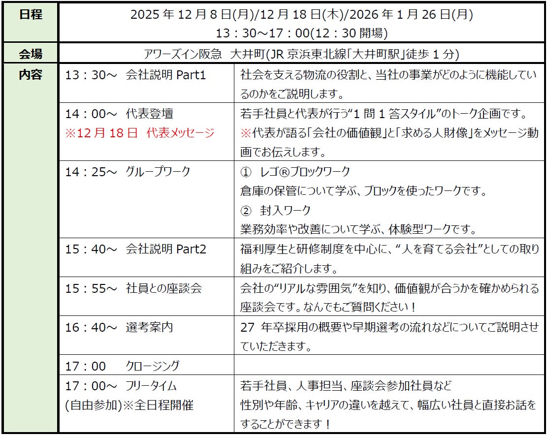 当日は、実際の業務をイメージできる体験型グループワークと、現場で働く社員との座談会を中心に構成。倉庫業の役割や働き方を自分ごととして理解できるプログラムとなっています。さらに、12月8日(月)と1月26日(月)には代表の曽根和光も登壇し、当社が大切にしてきた仕事観や求める人財についてお話しします。