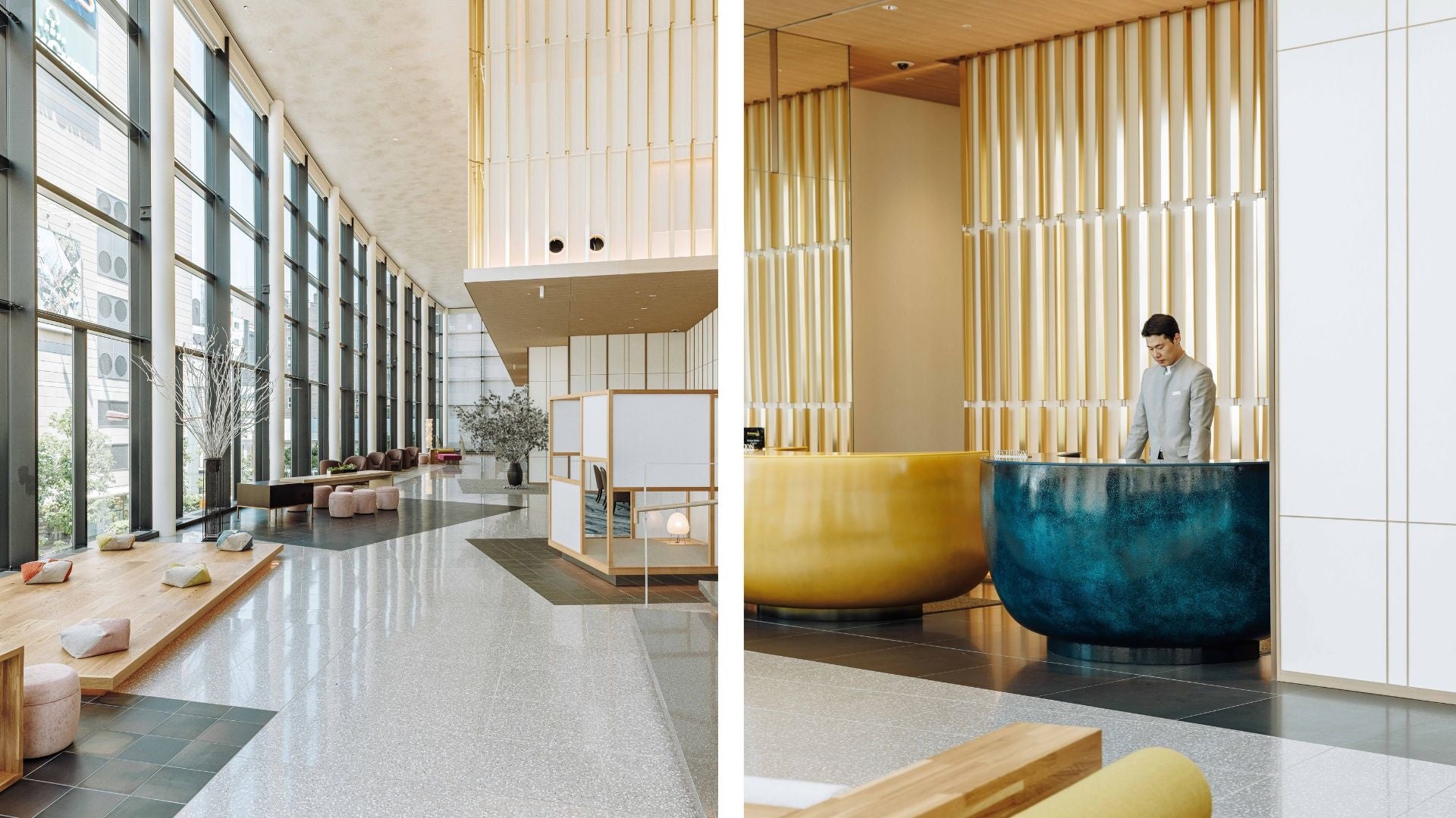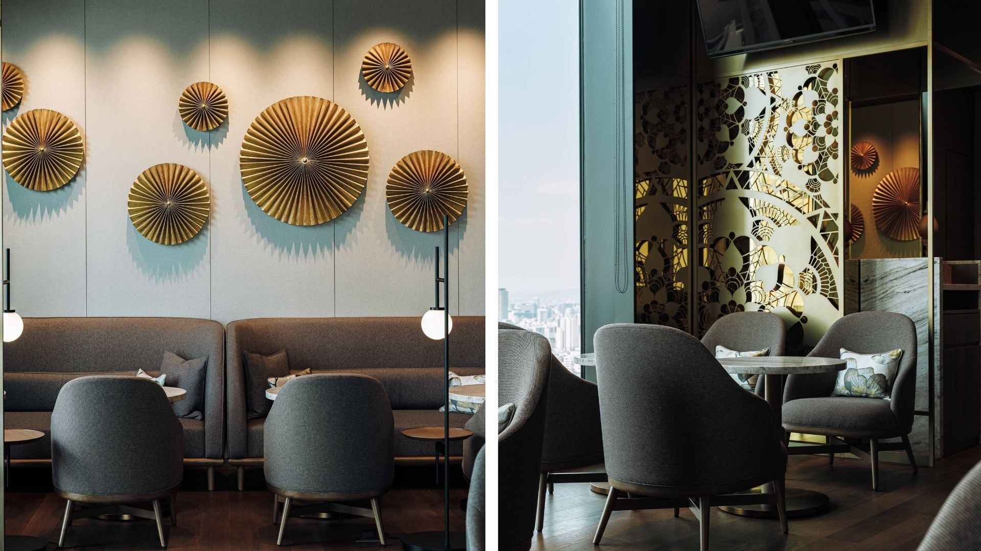 センタラグランドホテル大阪は、「日本とタイの美と文化の融合」をコンセプトに掲げ、日本の洗練された美意識とタイの活気ある文化を融合させたモダンで美しい空間が随所に広がっています。ロビーに一歩足を踏み入れると、ゴールドの装飾やタイの路地を彷彿とさせる雰囲気が感じられ、そこに茶器がモチーフのフロントデスクや調度品など日本ならではの装飾が交わり、多面的でありながら調和のとれた落ち着きある空間をご体験いただけます。