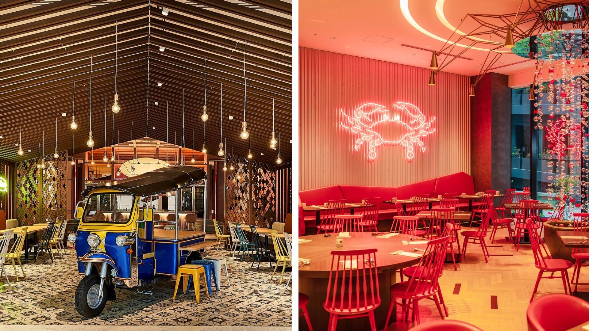ホテル2階にあるタイ料理レストラン「スアンブア」のエントランスには、タイを象徴するトゥクトゥクが飾られ、タイの伝統的なパターン柄を現代風にアレンジしたインテリアが美しい店内には、本場さながらのスパイスの香りが漂います。隣接するシーフードレストラン「エンバシー・オブ・クラブ」は、アイコニックな蟹のモチーフや真っ赤なインテリア、シャンデリアが印象的でクラブマーケットの雰囲気を表現しています。