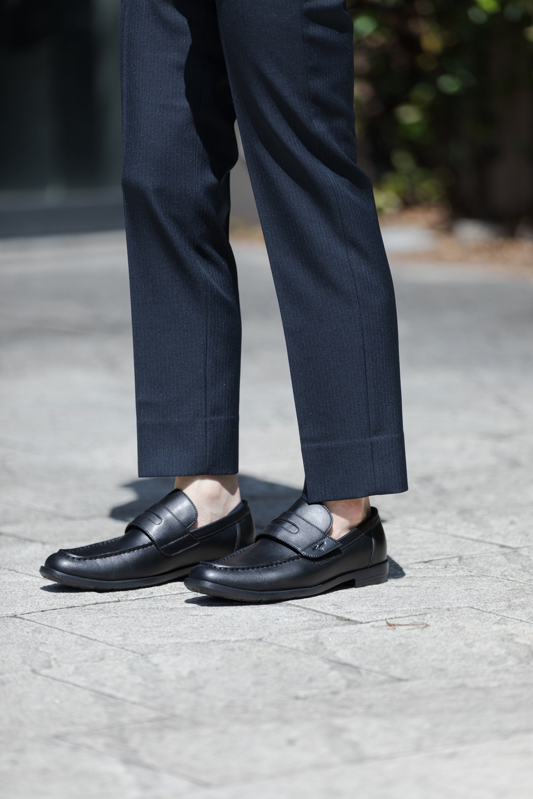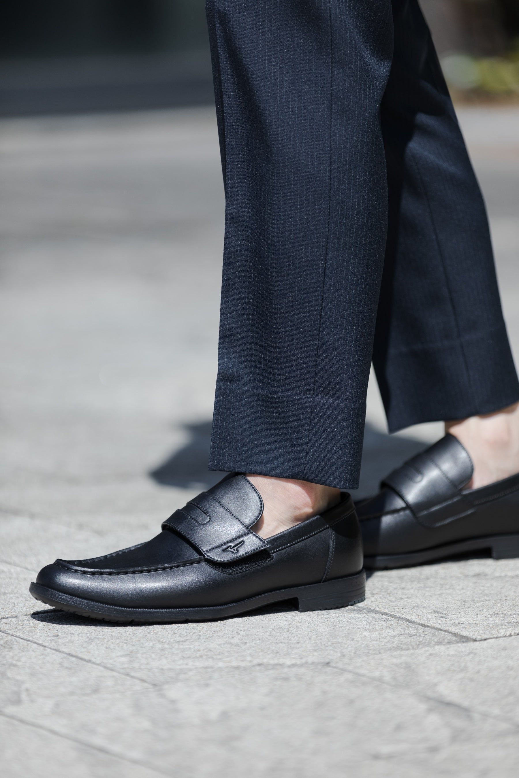 今回のローファーは、スポーツ発想で誰でも簡単に着脱しやすく“楽ビジ”をテーマに企画しました。見た目は通常と変わらないローファーでありながら、正面のベロ部分が大きく開閉する構造によりスムーズにローファーの着脱が可能となり、靴ベラを使わずに片手で履くことができます。この構造は、野球スパイクを参考にしているため、激しい動きでも外れにくい仕様です。また、ベロ部分を大きめに設計し足の甲にあたる面積を大きくすることで、歩行時のフィット感を高めるなど、着用感にもこだわった1足となっています。