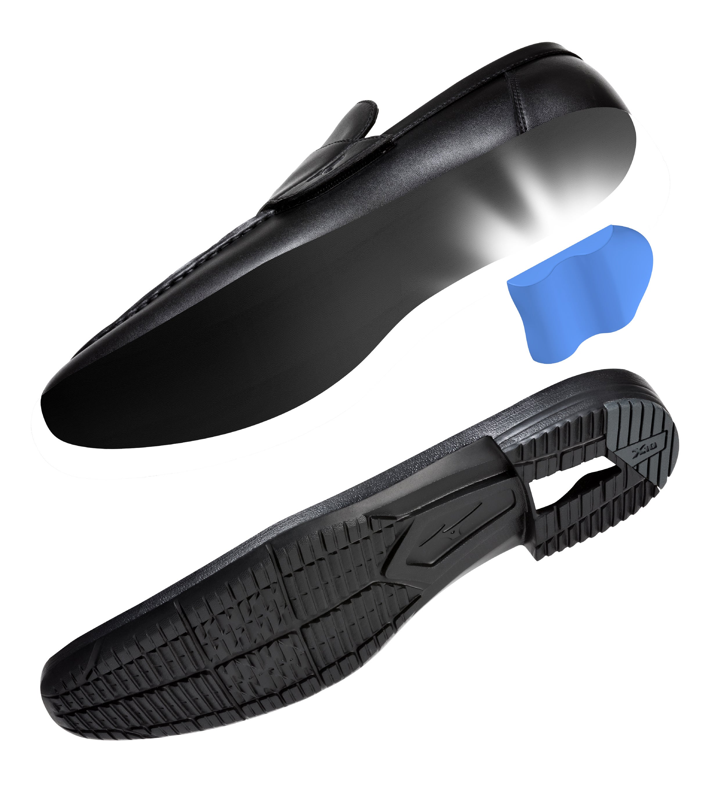 その他、かかと部分にはミズノがランニングシューズなどに搭載するソール構造「ミズノウエーブ」を採用しています。これは、ミズノ独自のテクノロジーで波形状の構造が優れた「クッション性」と「安定性」の相反する機能を併せ持ち、着地時の衝撃緩和や足のグラつきを抑え、膝や腰への負担を軽減します。また、通気性に優れた抗菌防臭加工のインソールを挿入しており、取り外して手洗いもできるなど、衛生面にも配慮しています。片方の重さは、約280gとランニングシューズと変わらない軽さで、一般的な革靴と比べ約30%の軽量化(青山商事比)を実現しました。