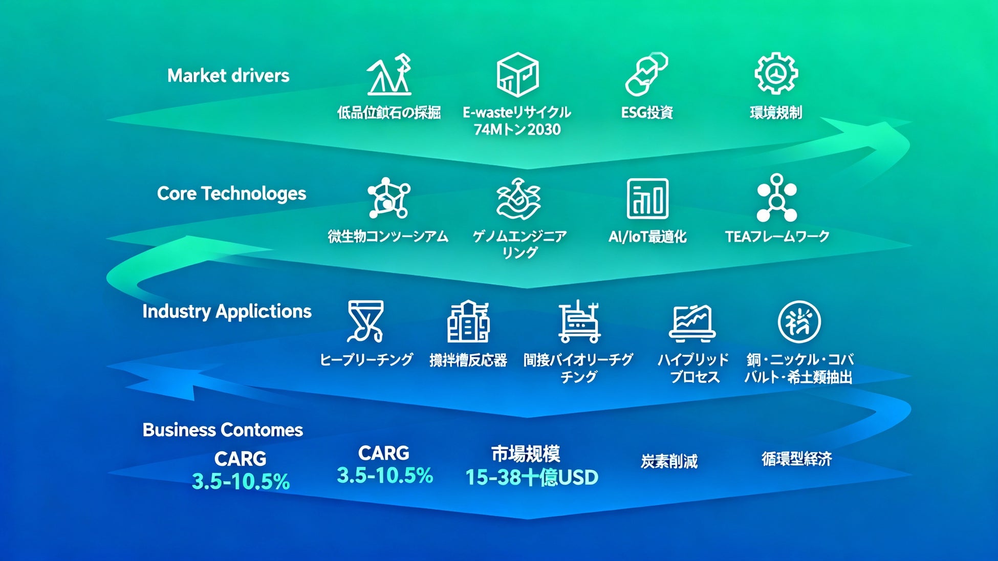 また、本白書は、バイオリーチング技術の全体像を、市場動向、技術動向、産業応用、ビジネス成果の四層フレームワークで整理し、読者が各層の相互作用を理解しながら戦略的判断を下せるよう設計されている。