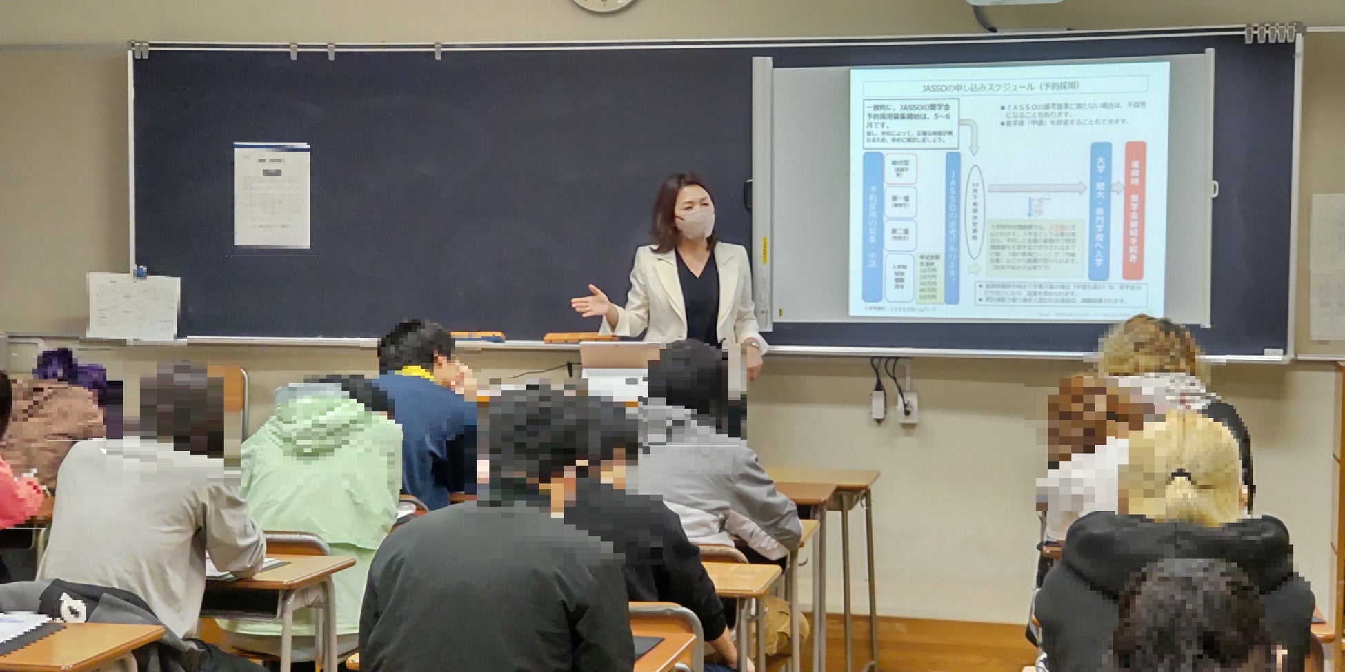 4月24日(水)、一般社団法人NTSセーフティ家計総合研究所(東京都港区)は、東京都立東久留米総合高等学校(東京都東久留米市)の定時制3年生(卒業年次生)向けに、「進学資金と奨学金~奨学金とのつき合い方~」と題し、独立行政法人日本学生支援機構(以後JASSO)の奨学金について、進学に必要な資金の把握、貸与型・給付型それぞれの違いと整理、その他の奨学金の特徴など、約45分の講演を行いました。