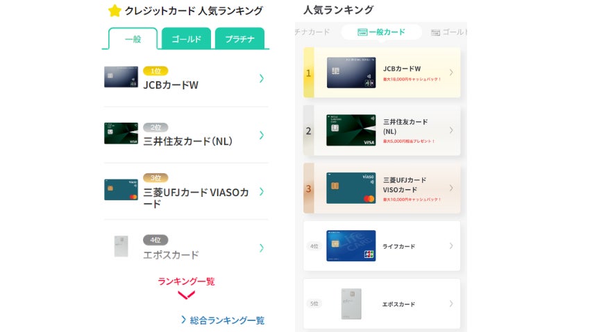 例えばクレジットカードに関しては、総合ランキングだけでなくカードの種類別や各キーワードごとにランキングを表示しており、ユーザーの目的に合わせて人気商品を探せます。