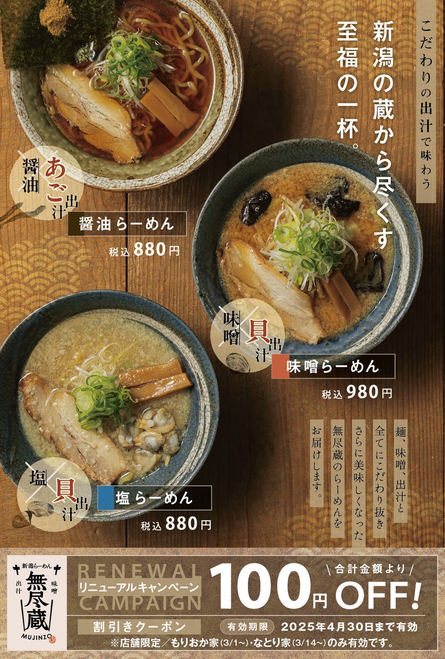 株式会社キタカタ(本社:新潟県新潟市)は、「新潟らーめん無尽蔵 味噌と出汁(みそとだし)なとり家」を2025年3月14日(金)にイオンモール名取の1Fにてリニューアルオープンします。新潟発祥のらーめん店「無尽蔵」がこだわる、新潟の蔵元で丹念に仕込まれた味噌に、貝やあごなど使った風味豊かな出汁を合わせ、日本人の心に響く「和の感動」をこめた至福の一杯をお届けします。