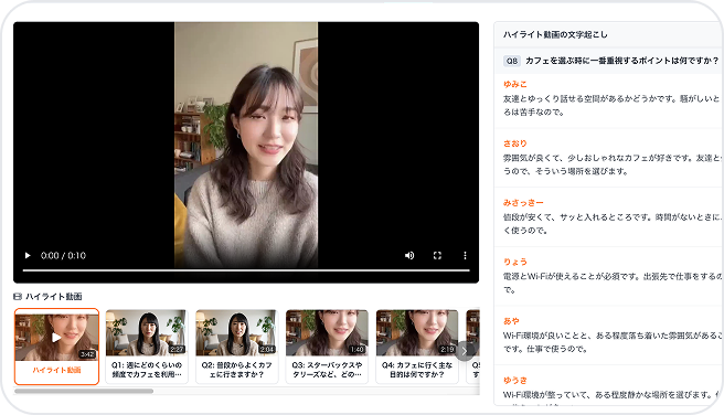 インタビューは録画され、回答内容は自動で文字起こし。ローデータとして閲覧・ダウンロードが可能。