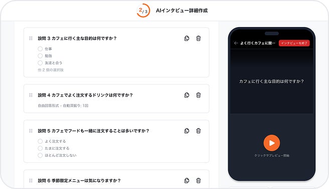 目的を入力するだけで、AIが最適な調査票を自動生成。編集も自由自在。