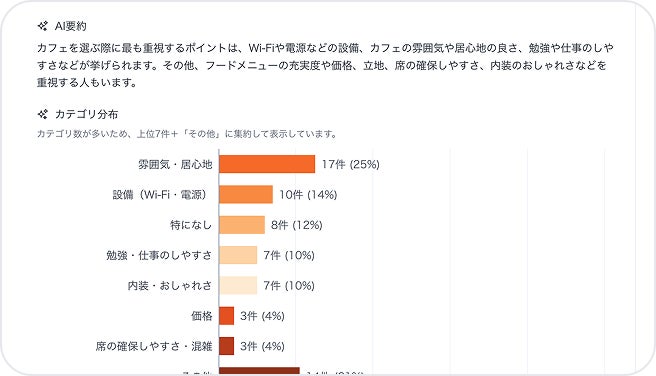 膨大な回答情報から要約、定量分析、アフターコーディング(定性コメントの定量化)を自動実施。