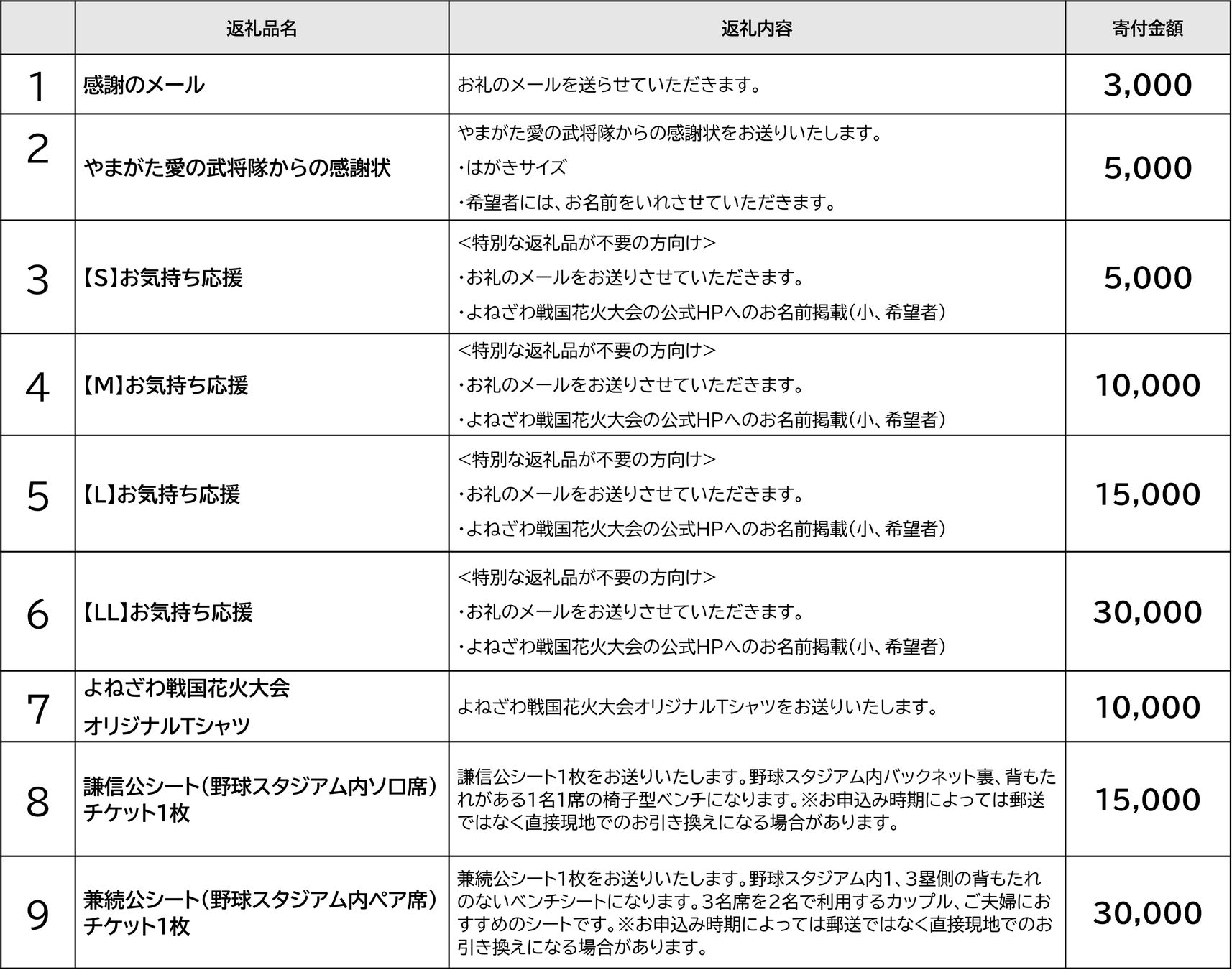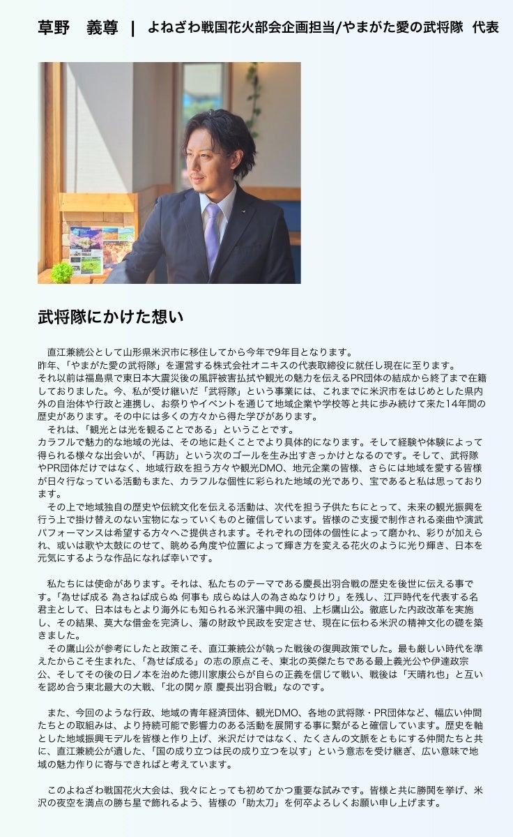 10 ⽉12 ⽇(⼟)⼭形県⽶沢市営野球場にて開催される「よねざわ戦国花火」にて「慶長出羽合戦」をテーマにした新作演武披露および最終フィナーレの「勝鬨花火」をクラウドファンディングで実現させたい!