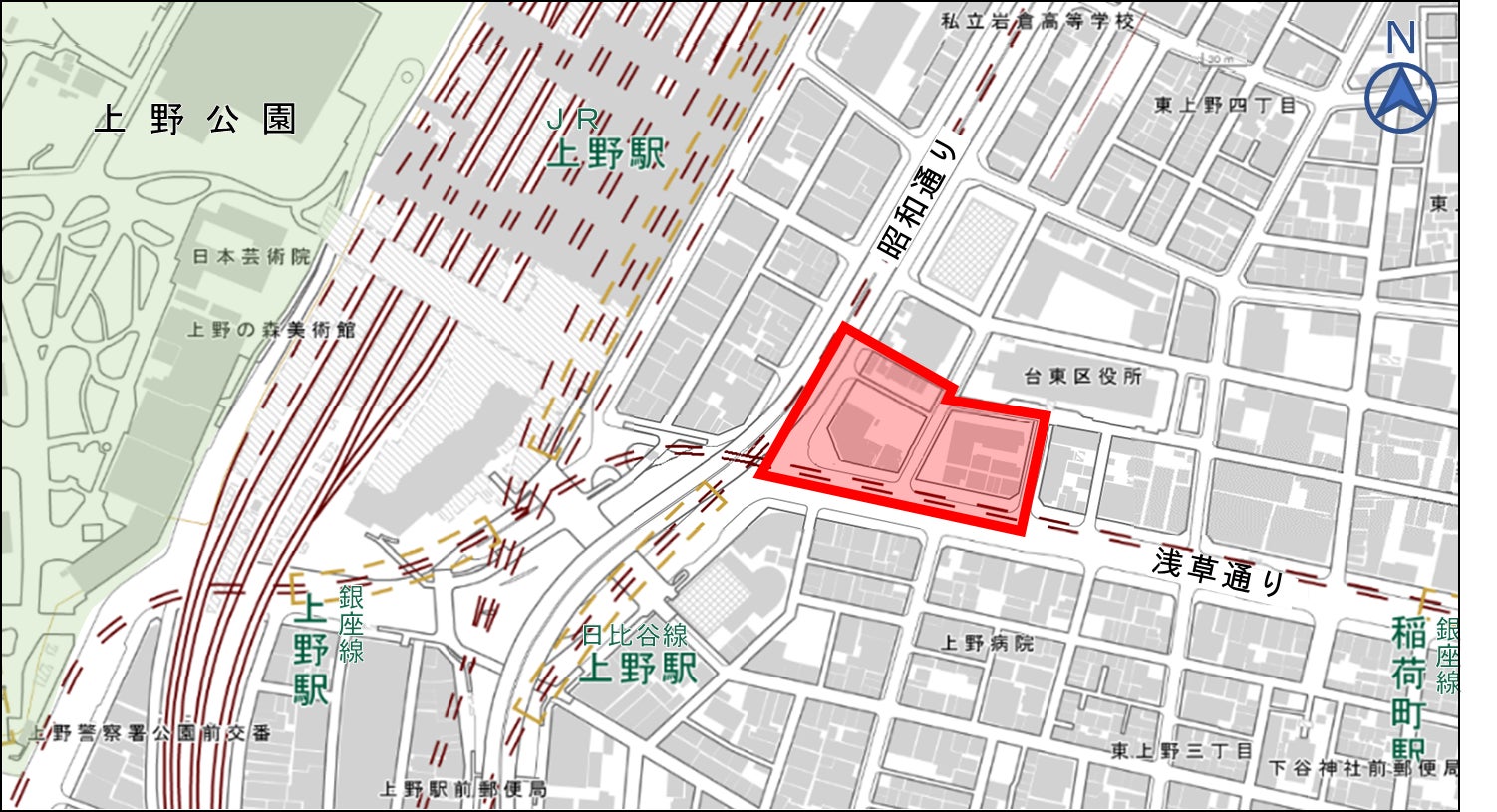 本地区の検討区域は、昭和通りと浅草通りの交差点に位置する約1.0haを想定しており、上野から浅草を結ぶ玄関口にふさわしい都市機能の整備を図ってまいります。