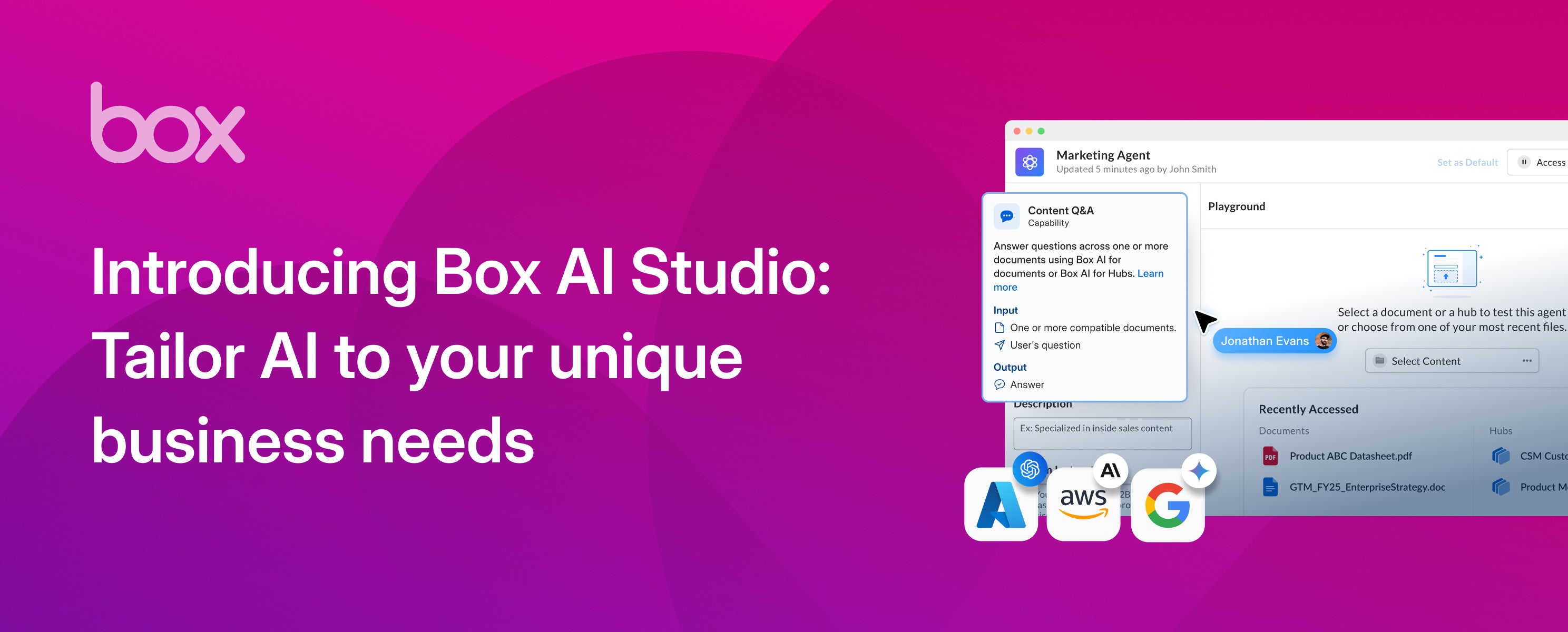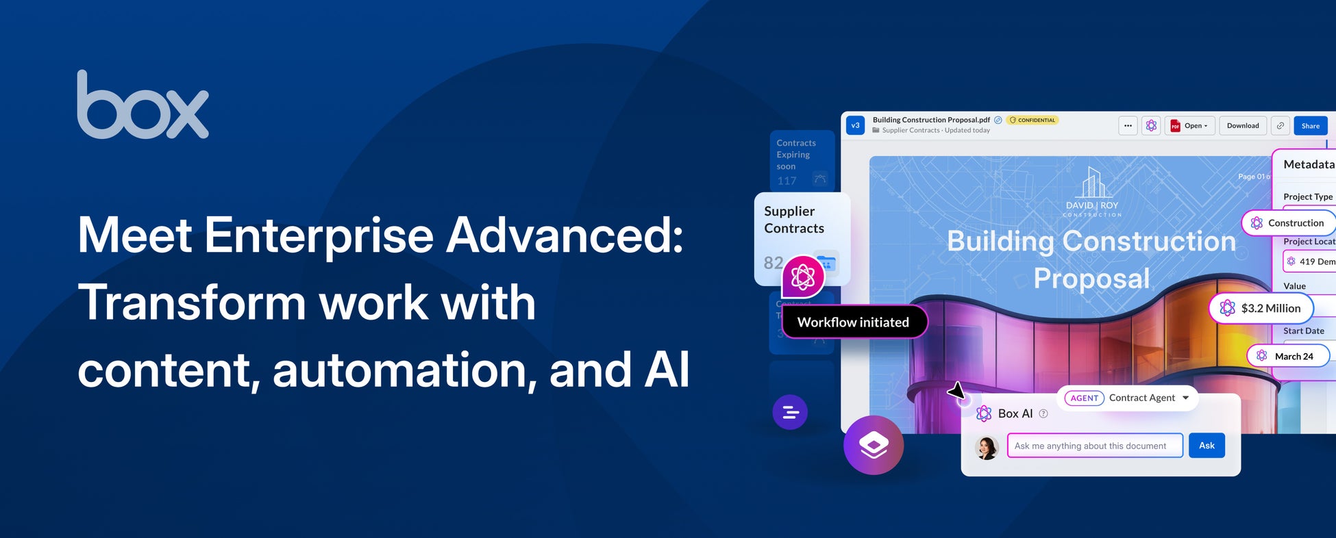 インテリジェントコンテンツ管理 (ICM) プラットフォームのリーディングカンパニーであるBox, Inc. (NYSE:BOX)は、本日、新しいEnterprise Advancedプランおよびそれに含まれる、企業のコンテンツ管理の方法に革新をもたらす一連のAI搭載機能の提供を開始しました。本日より、Box Apps、Box AI Studio、Box Doc Gen APIの利用が可能です。これらの新たなイノベーションは、BoxのICMプラットフォームのフル機能を単一のパッケージにまとめたもので、ワークフローの自動化や、価値あるインサイトの抽出、企業の業務プロセスの改善をBoxで実現できます。