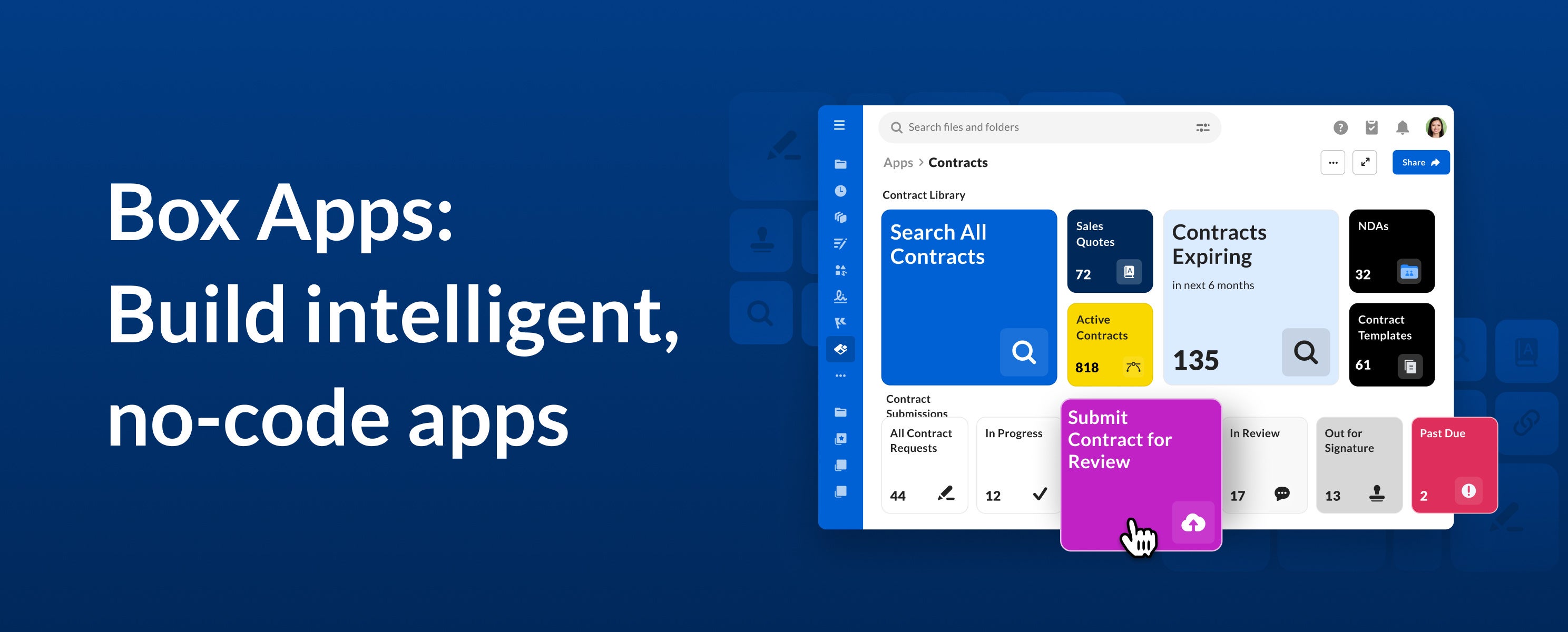 法務部門は、Boxに一元管理された契約書のメタデータ抽出を自動化する契約書アプリを作成し、期限に関するアラートの組み込みや契約書の作成、レビュー、承認、署名のための送信プロセスの標準化を実装できます