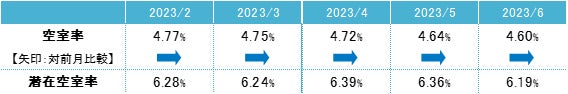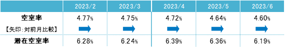 空室率は前月比マイナス0.04ポイントの4.60%となった。前月から小幅に低下し、緩やかな低下傾向が続いている。主要エリア内での集約や拡張移転による比較的大口の成約があった。潜在空室率は前月比マイナス0.17ポイントの6.19%となっている。オフィス需要は拡張移転や館内増床等の前向きな動きの割合が高い状況にある。需要は引き続き小口の面積帯が中心だが、大口の需要も増えつつある。