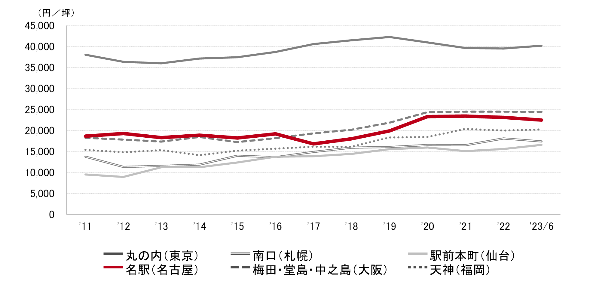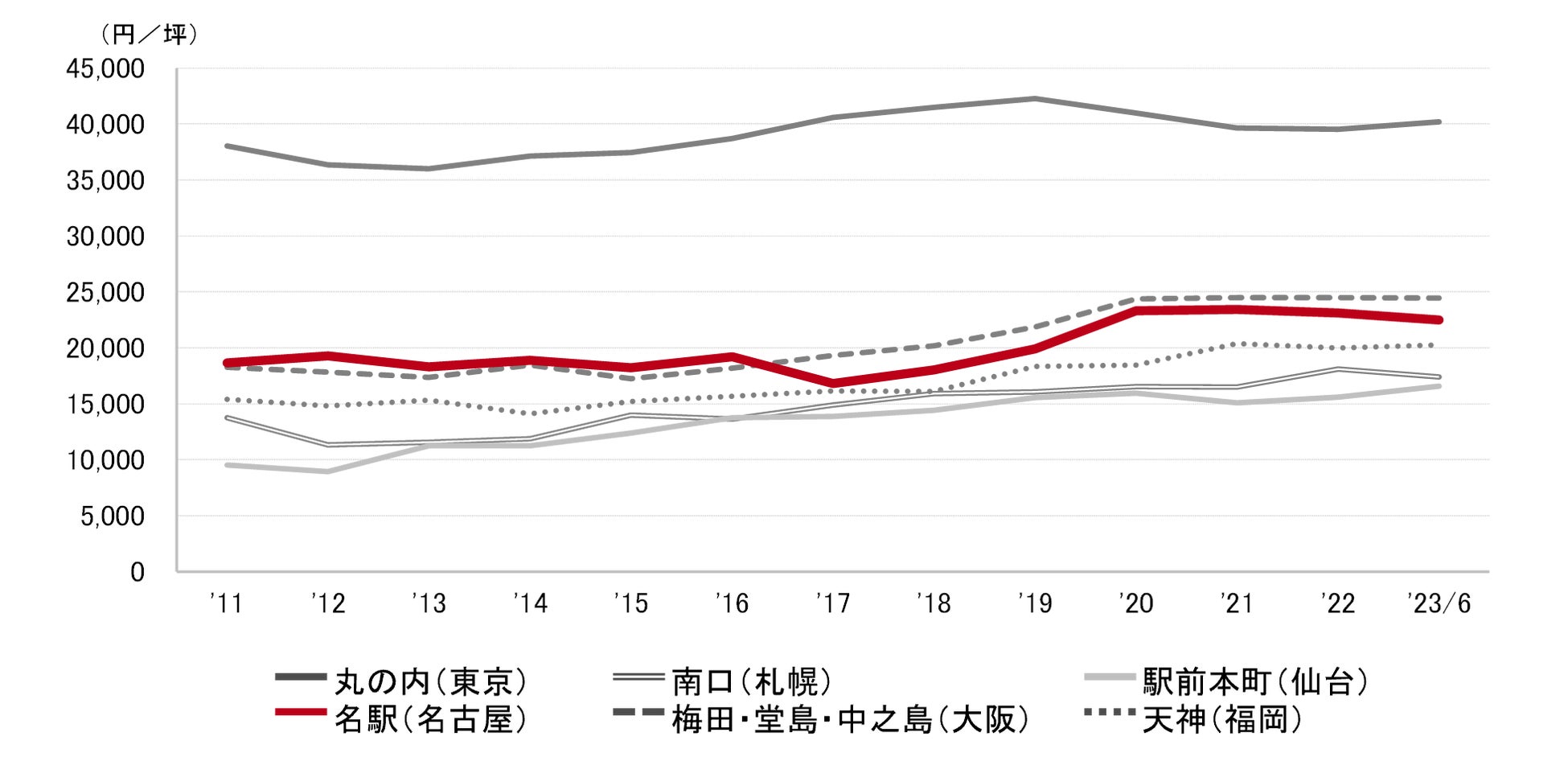 <募集賃料の推移(6大都市 大規模ビル・主要駅前地区)>