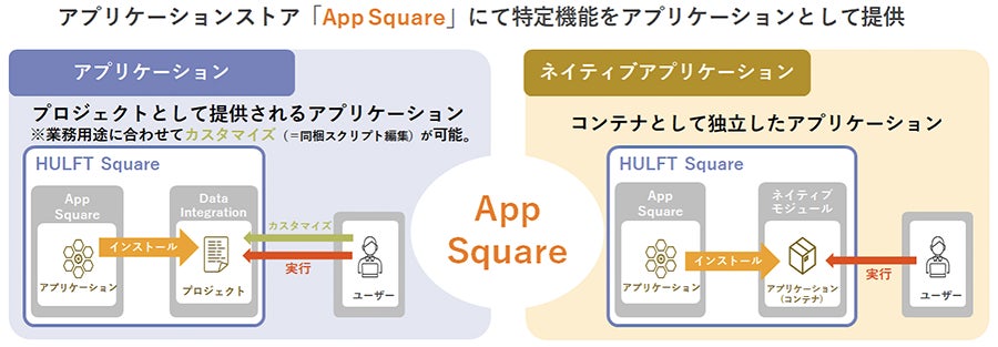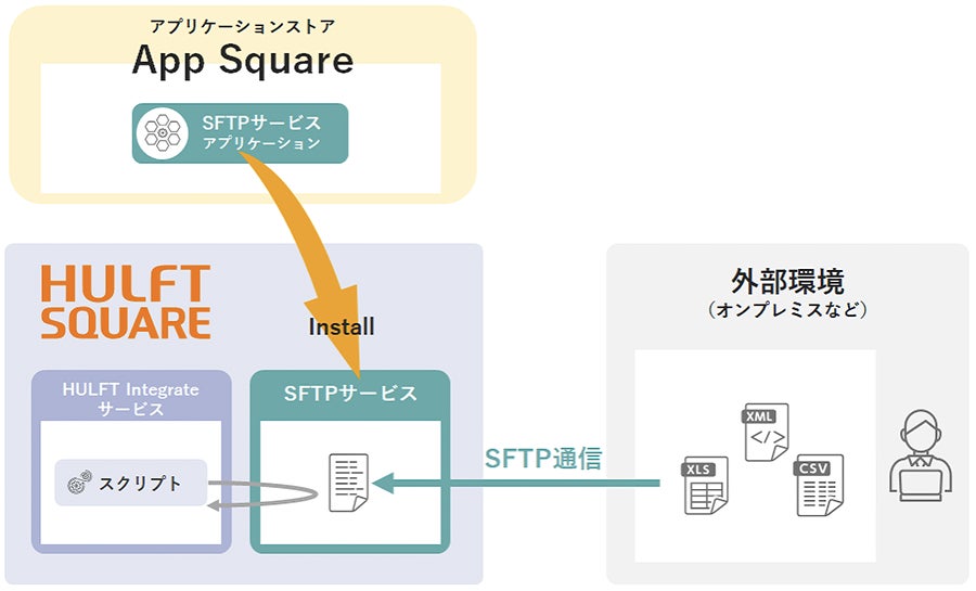 SFTPサービスは、HULFT Squareプラットフォーム上でサービスとして動作する「ネイティブ アプリケーション」として提供します。今後はHULFT Integrateのスクリプト テンプレートに加え、さまざまなサービスを順次リリースします。