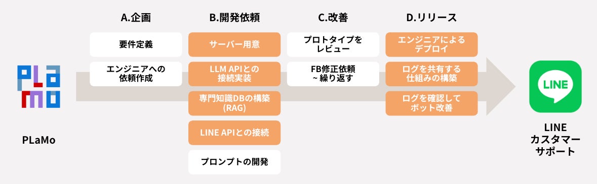 AIプロダクトを開発し公開するまでには下記の例のように様々な工程が発生し、制作期間や費用に大幅なコストがかかってしまうところ、これらの工程をノーコードで構築できる「miibo」の豊富な機能を活用することで、会話型AIプロダクトの本質的な体験開発にフォーカスすることができます。