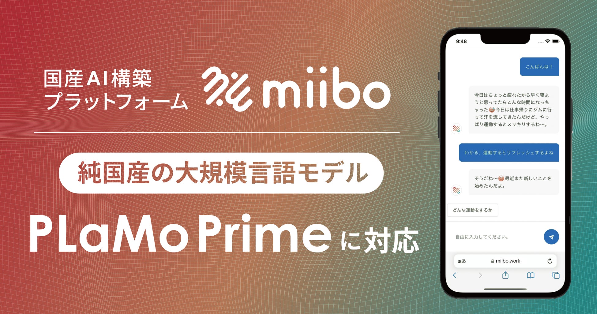 株式会社miibo(本社:東京都港区、代表取締役:功刀雅士)は、当社が提供する会話型AI構築プラットフォーム「miibo」において、株式会社Preferred Networks(以下、PFN)が提供する純国産大規模言語モデル「PLaMo Prime」への対応を開始したことをお知らせいたします。