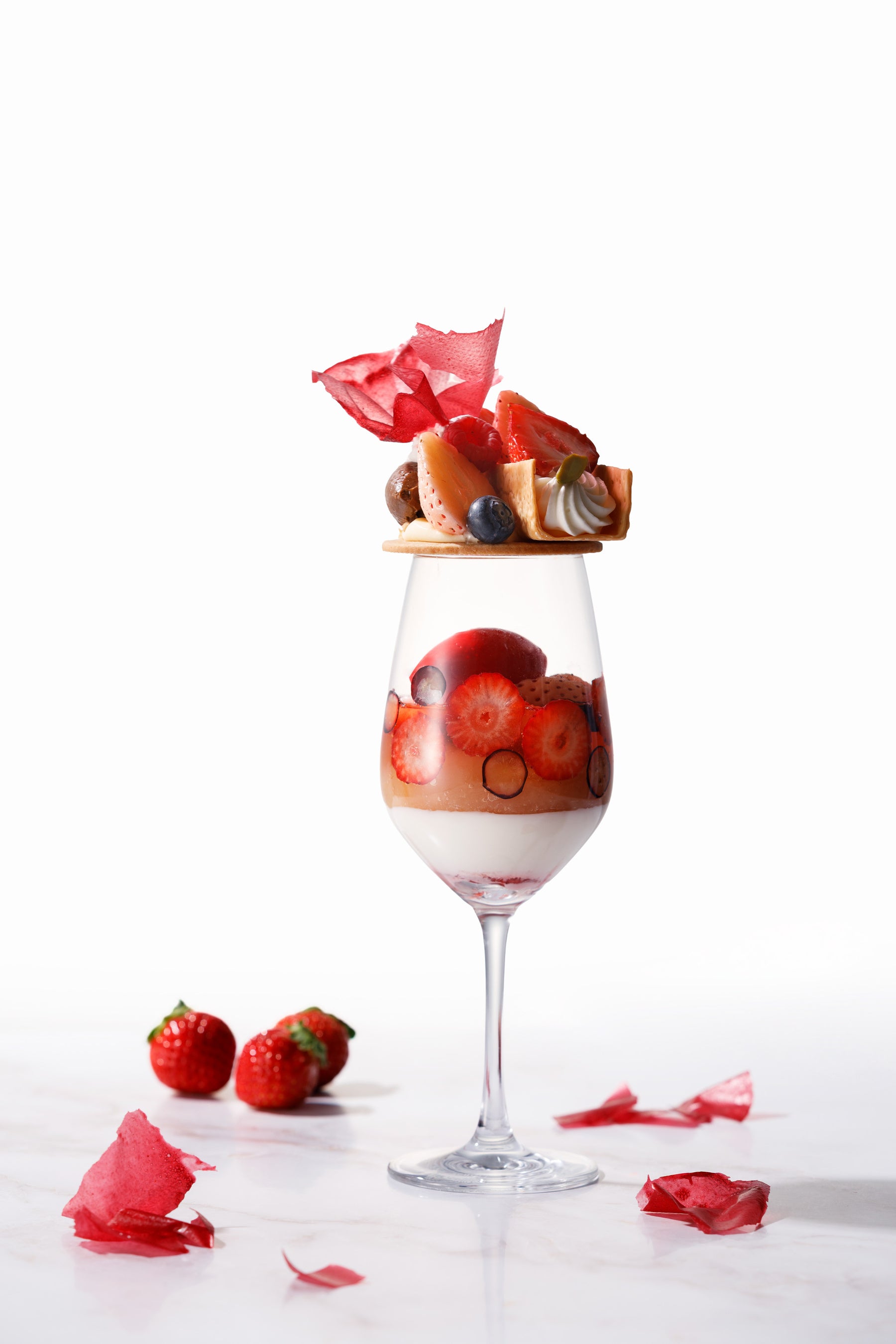 苺を贅沢に重ね、ココナッツとチョコと調和した果実感あふれる「苺とココナッツのパフェ」は1名様につき1杯提供。最後までさっぱり楽しめる春のパフェは、ビジュアルの楽しさにもこだわった、シェフ一押しの一品です。