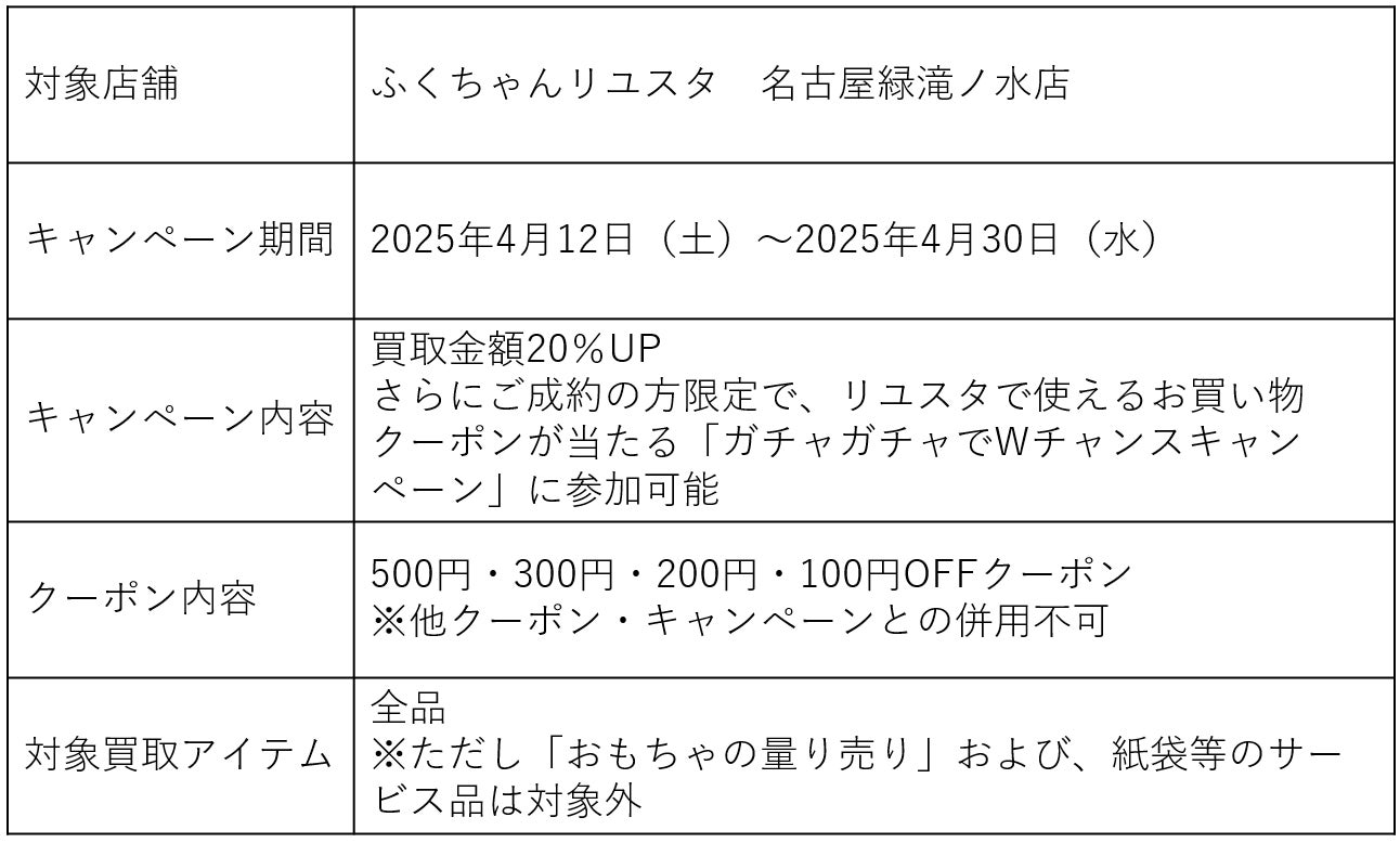 レクストホールディングス株式会社(本社:大阪府大阪市中央区、代表:小栗 拓也 )の子会社で、キッズリユースサービス「ふくちゃんリユスタ」および総合買取サービス「福ちゃん」を展開する株式会社REGATE(本社:大阪府大阪市中央区、代表:福島 道子)は、2025年4月12日(土)に新店舗「ふくちゃんリユスタ 名古屋緑滝ノ水店」・「福ちゃん 名古屋緑滝ノ水店」をオープンします。人口24万人以上を擁し、豊かな自然も魅力の住宅地域、名古屋市緑区に位置する当店は、「ふくちゃんリユスタ」・「福ちゃん」初の2階建てであり、「ふくちゃんリユスタ」においては売場面積150坪、店頭商品数1万点を誇る店舗です。また、オープンを記念して、同日より期間限定で、「ふくちゃんリユスタ 名古屋緑滝ノ水店」・「福ちゃん 名古屋緑滝ノ水店」オープン記念キャンペーンを実施します。
