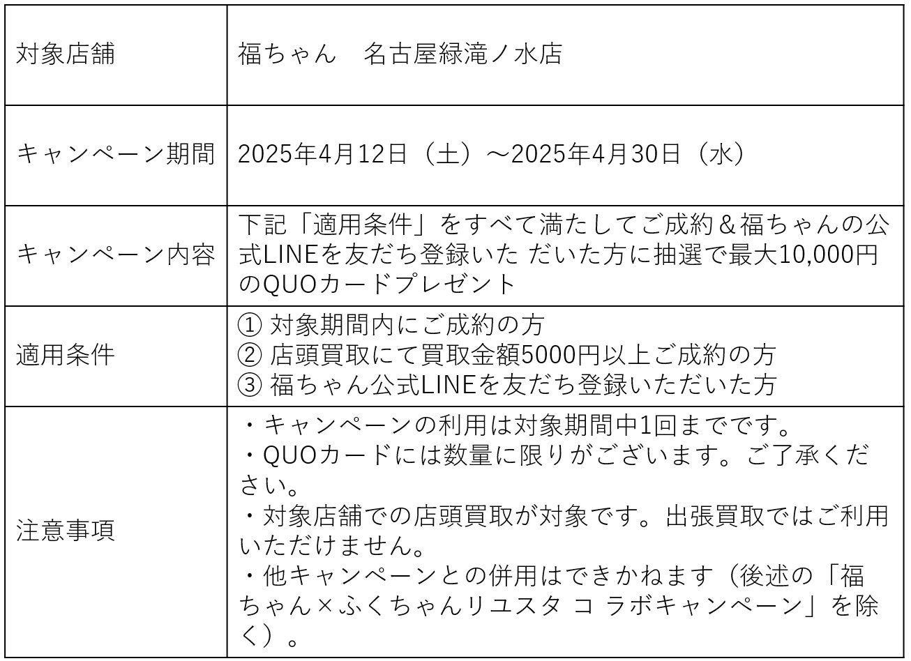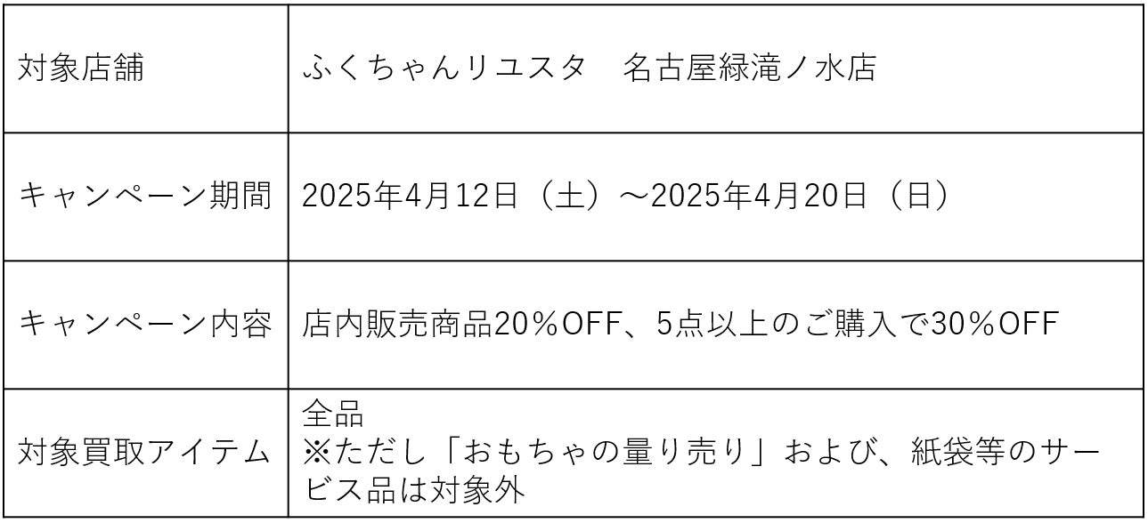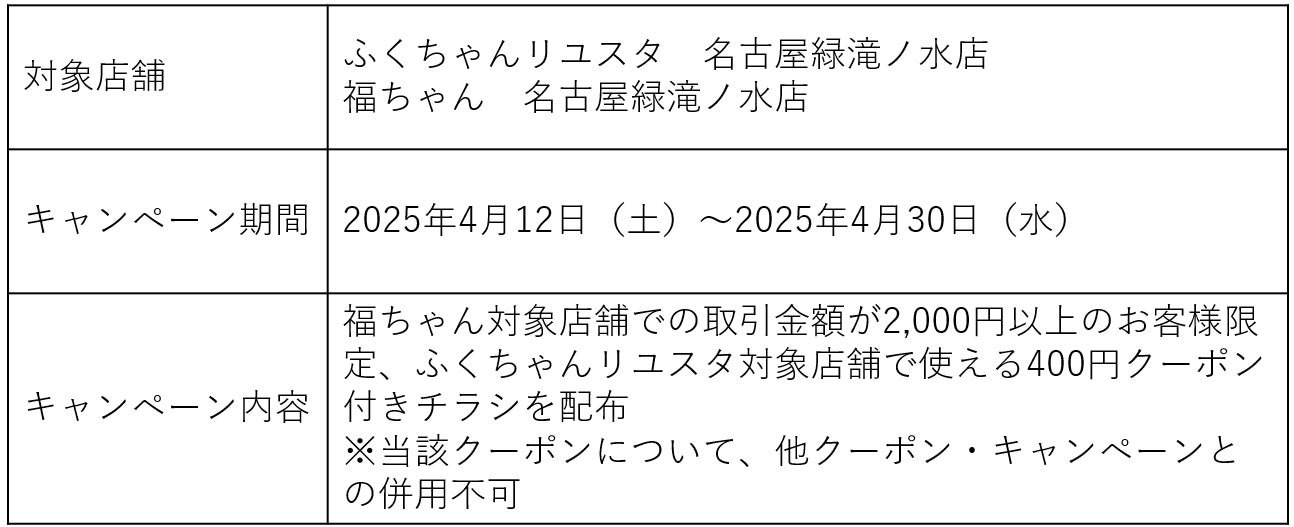 オープンを記念して、「福ちゃん 名古屋緑滝ノ水店」「ふくちゃんリユスタ 名古屋緑滝ノ水店」ではオープン日である2025年4月12日(土)より期間限定で各種キャンペーンを実施します。
