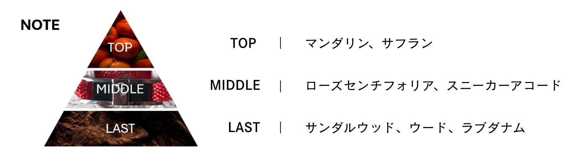 新品のスニーカーを思わせるユニークな香りを中心に、ローズセンチフォリアの上品なフローラル、マンダリンのはつらつとした爽やかさ、やわらかくもスパイシーなサフランがウードの深みと合わさることで、モダンで奥行きのある香りに仕上げました。肌へじんわりと広がり、長時間心地よい香りがしっかり続くのも特徴です。