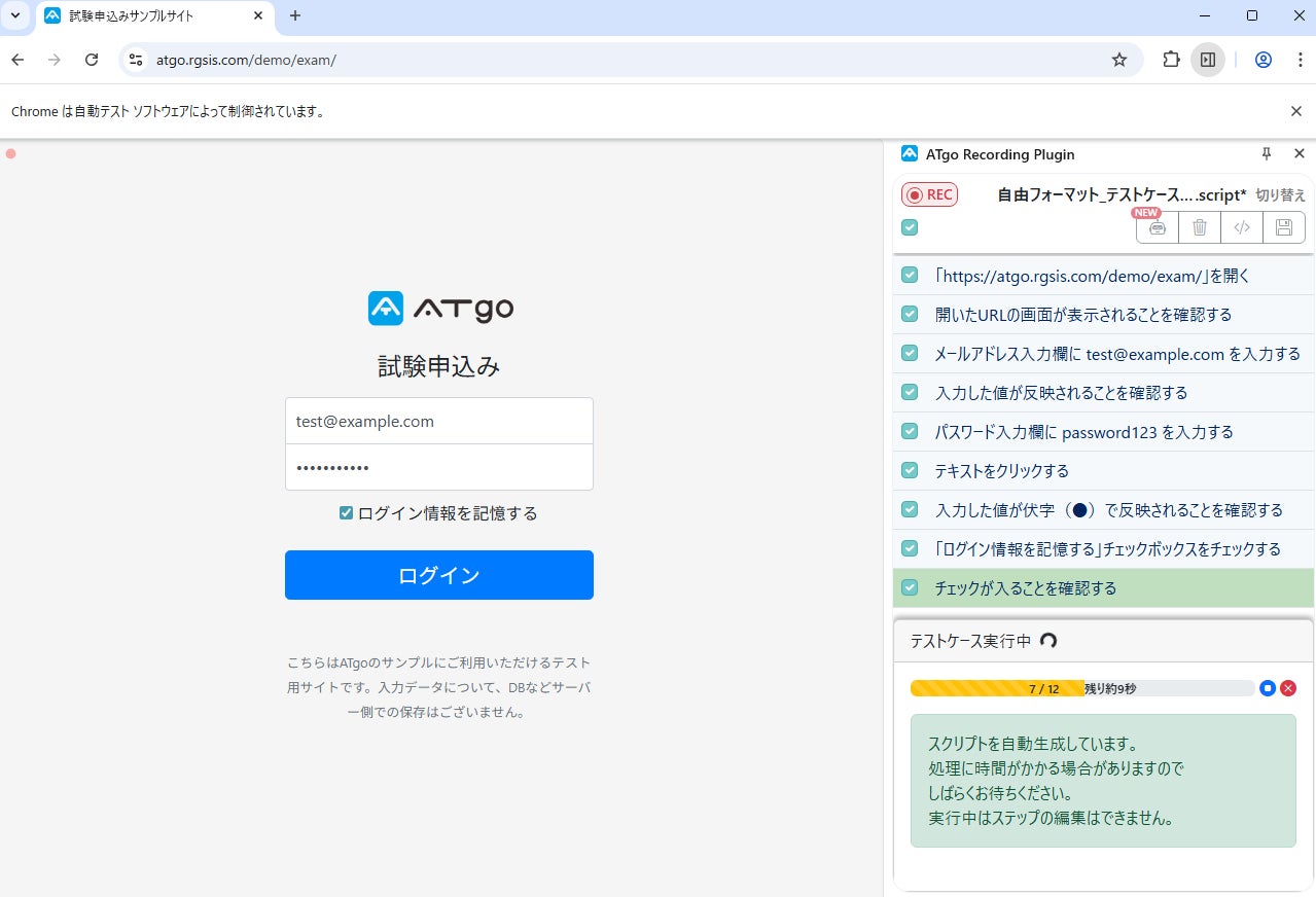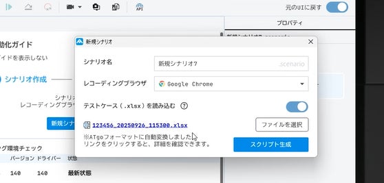 本機能は、Excelに記載された任意のテストケースを、AIが解析し、ATgoフォーマットのテストケースに変換した後、自動的に日本語テストステップおよび実行可能なテストスクリプトへ変換・生成する機能です。これにより、既存資産であるテストケースを活かして、その意図を反映した自動テストが実現できます。
