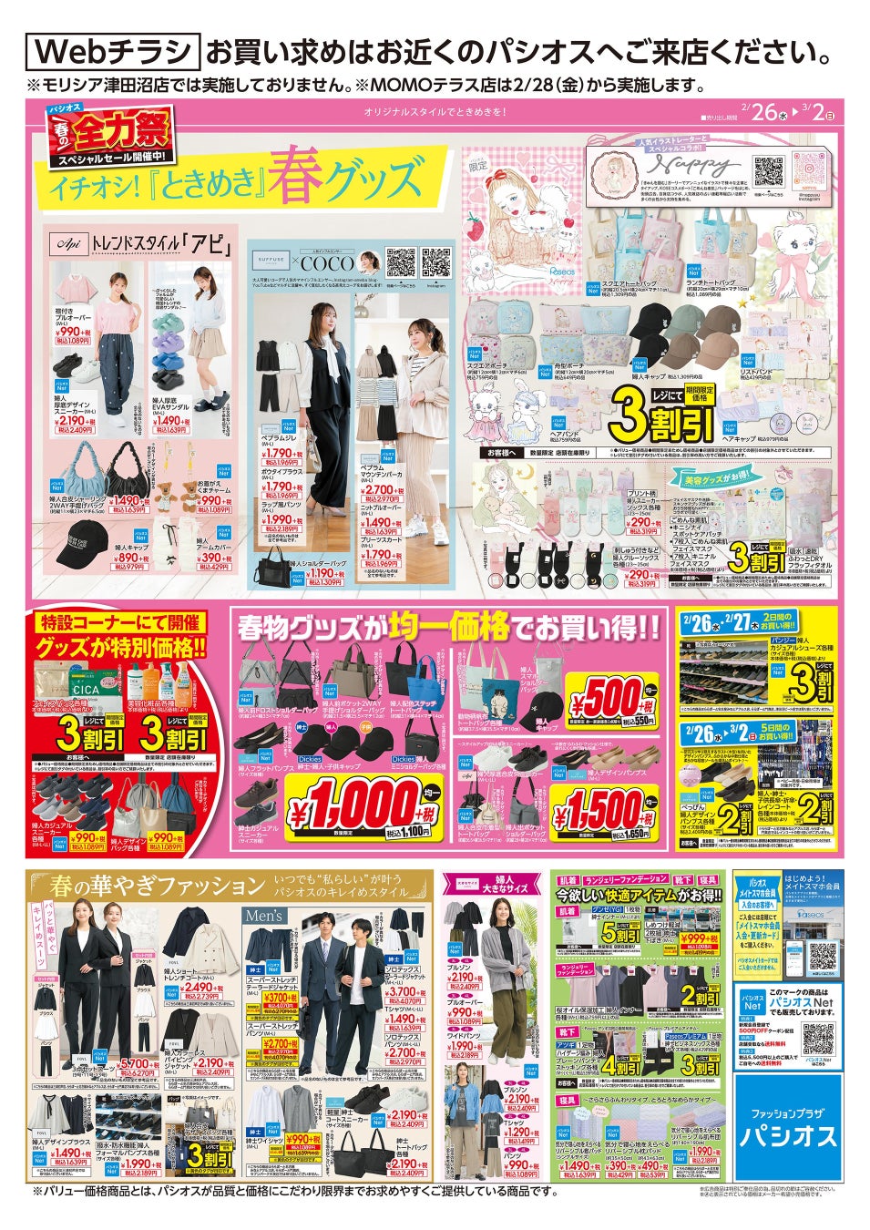 ・店舗 ※MOMOテラス店は2/28(金)より実施します。 ※モリシア津田沼店は非実施です。 詳しくは「パシオスチラシ」サイトをご確認ください ・公式オンラインストア ※パシオスNetでは一部取り扱いのない商品もございます |