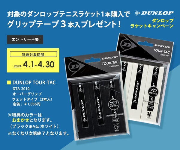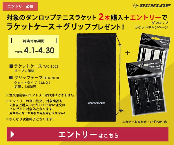 対象のダンロップテニスラケットを1本購入するとグリップテープが1点、2本購入&エントリーするとラケットケースとグリップテープの2点がもらえるキャンペーンとなります。