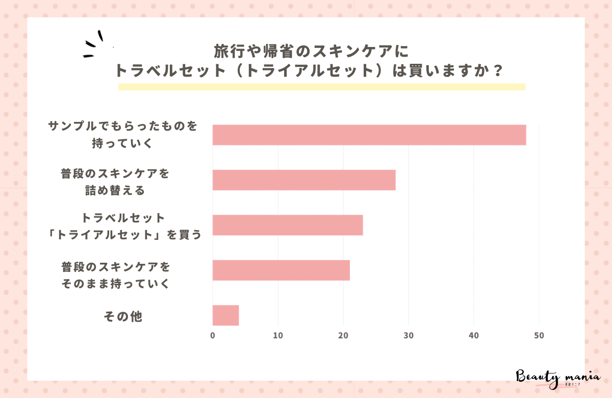「旅行や帰省のスキンケアにトラベルセット(トライアルセット)は買いますか?」とアンケート調査した結果、1位は『サンプルでもらったものを持っていく(48人)』、2位は『普段のスキンケアを詰め替える(28人)』、3位は『トラベルセット(トライアルセット)を買う(23人)』となっています。