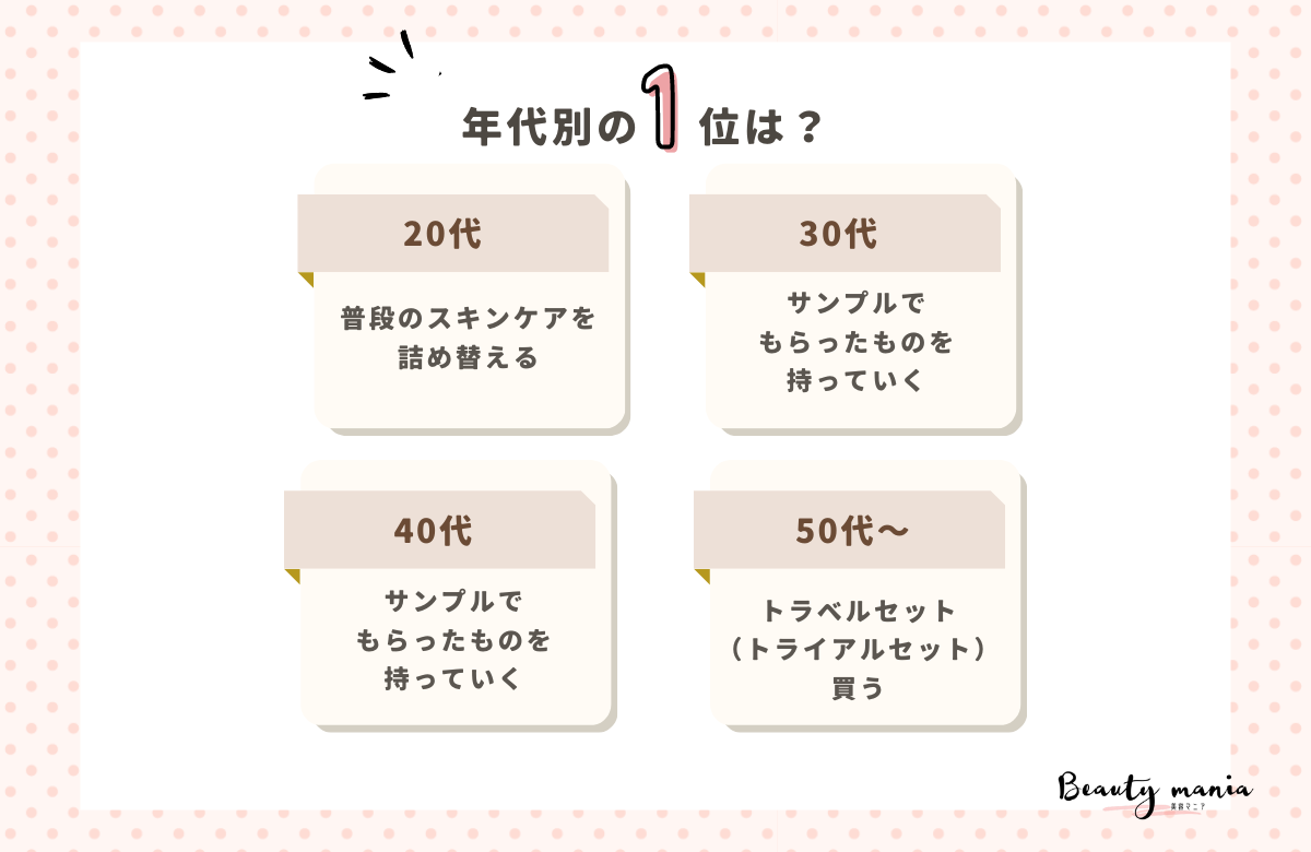 ・セットを買うと帰ってからの置き場所に困るので、普段使っているスキンケア用品をそのまま持っていく。そのほうが帰宅してからの荷ほどきも、普段の場所に戻せばいいだけなので楽に感じる。(30代)