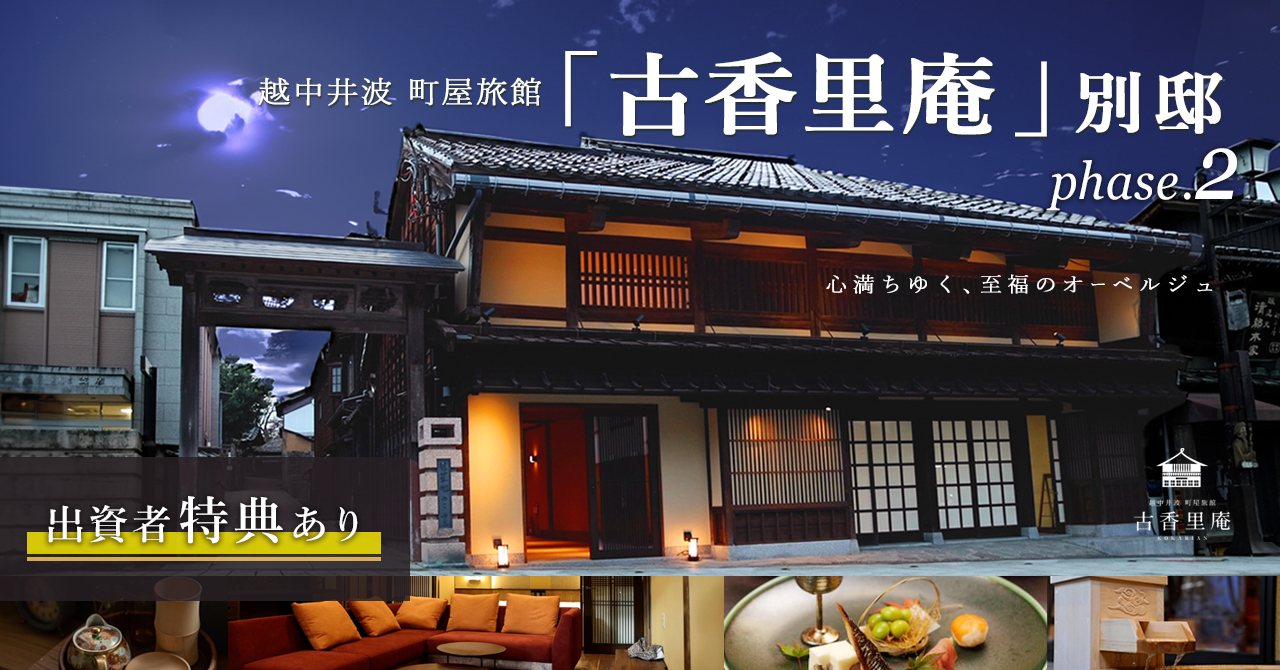 今回、対象不動産となる「越中井波 町屋旅館『古香里庵』別邸」は、富山県の食材を最大限に活かしてその場で味わってもらう」をコンセプトとした、1日1組限定の町屋旅館です。