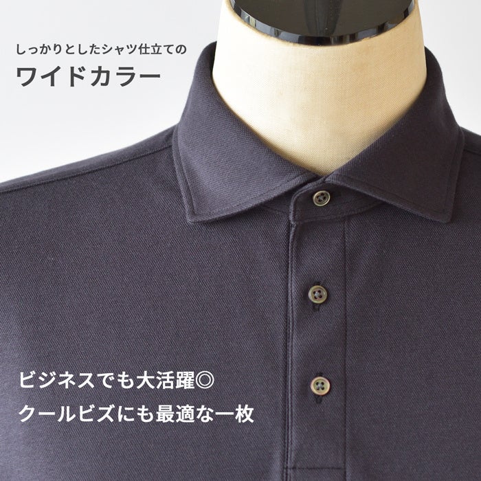 本製品は、ドレスシャツのようなワイドカラー仕立てで、ポロシャツというカジュアルさの中に上品さとフォーマルさを兼ね備えたデザインです。クールビズスタイルにも適しており、オフィスや商談などビジネスシーンにもしっかりと適応。毎日の通勤服としても、プライベートで着用する一着としても清潔感と快適性を両立した一枚です。