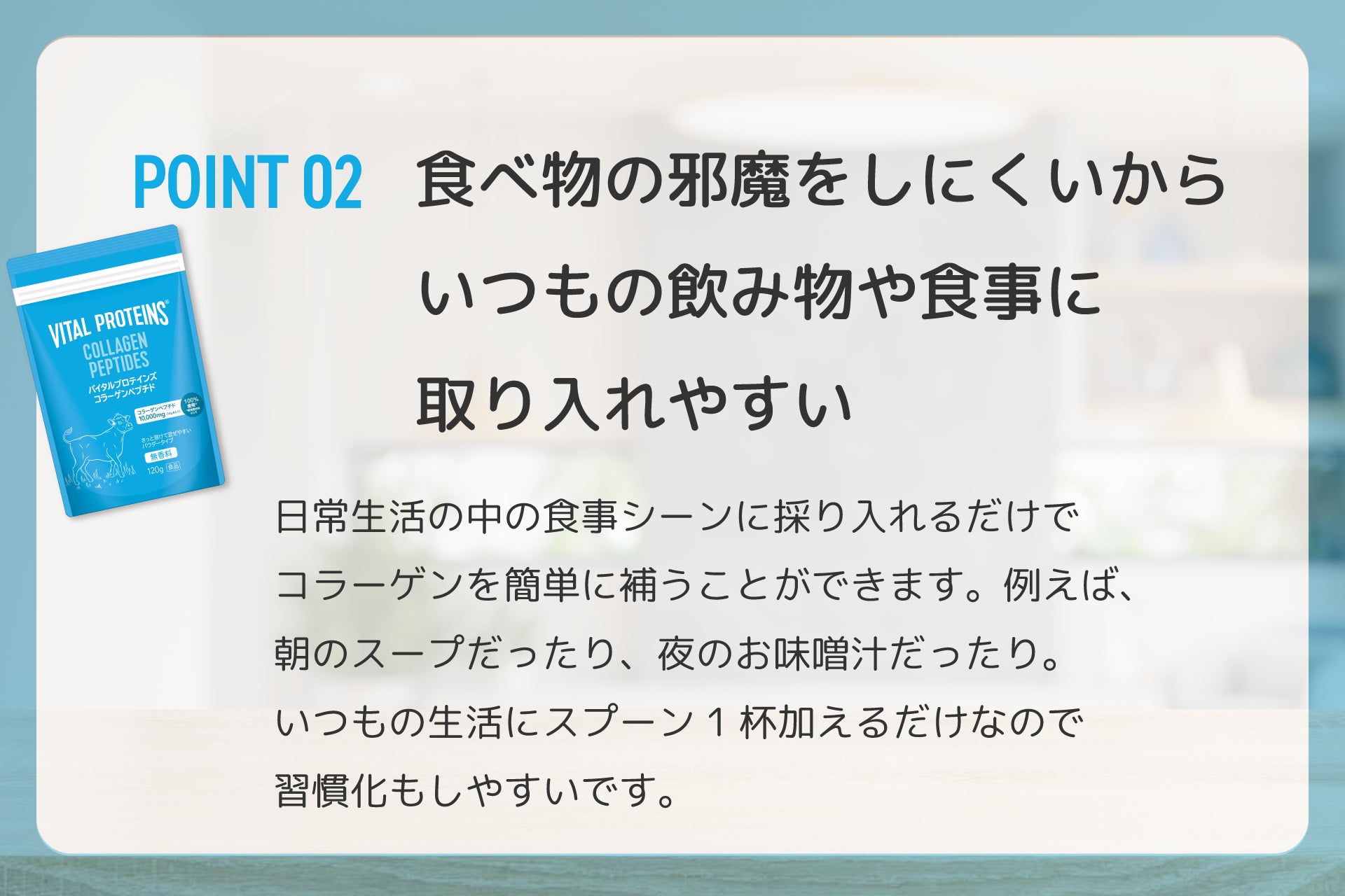 ② 水、コーヒーや牛乳などにもさっと溶け、無香料で、混ぜた食品のおいしさを邪魔せず、ヨーグルトや スムージー、コーヒー、ジュースほか、カレーやスープなどの料理にも混ぜることが可能。毎日摂っていただきたいからこそ原材料にはこだわり、厳選した「コラーゲンペプチド」を使用。