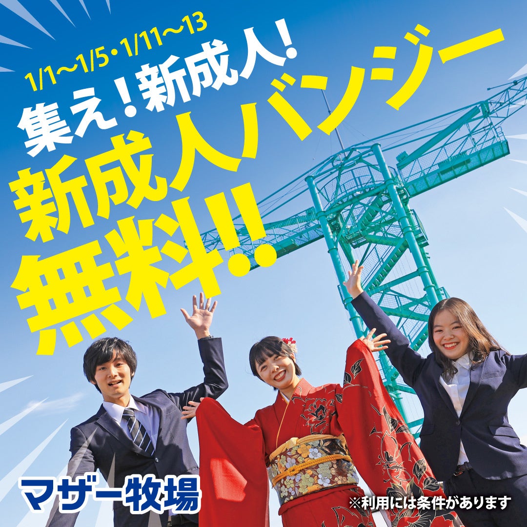 マザー牧場(千葉県富津市)では、新成人の方の門出をお祝いするべく、令和7年に成人式を迎える“新成人”は、「バンジージャンプ」の体験料が通常2,500円→無料になる“オトク”なキャンペーン「新成人バンジー」を2025年1月13日まで開催中です。