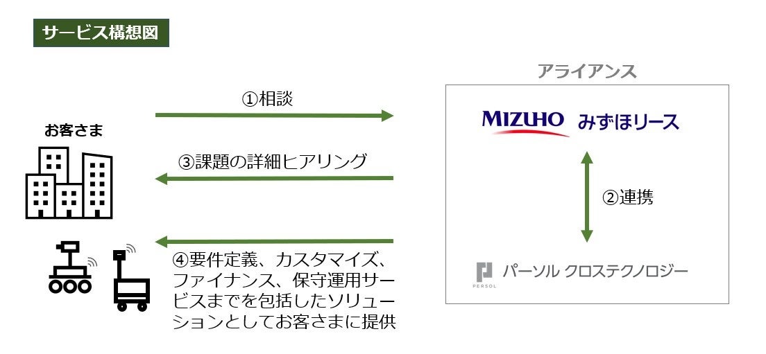 ロボット導入をご検討のお客さまや、人材不足解決・業務DX化ニーズが存在するお客さまを両社にてそれぞれ探索し、業務の課題や目指す姿をヒアリングします。その課題を解決するために、みずほリースが所有するさまざまなロボットの中から最適なものを選択し、パーソルクロステクノロジーがそれをお客さまに合わせてカスタマイズします。要件定義、カスタマイズ費用、ファイナンス、保守運用サービスまでを包括したソリューションとしてお客さまに提供するスキームの構築に努めます。当該スキーム構築が叶えば、お客さまの課題解決に対し、上流から下流まで一気通貫でご支援することが可能となります。