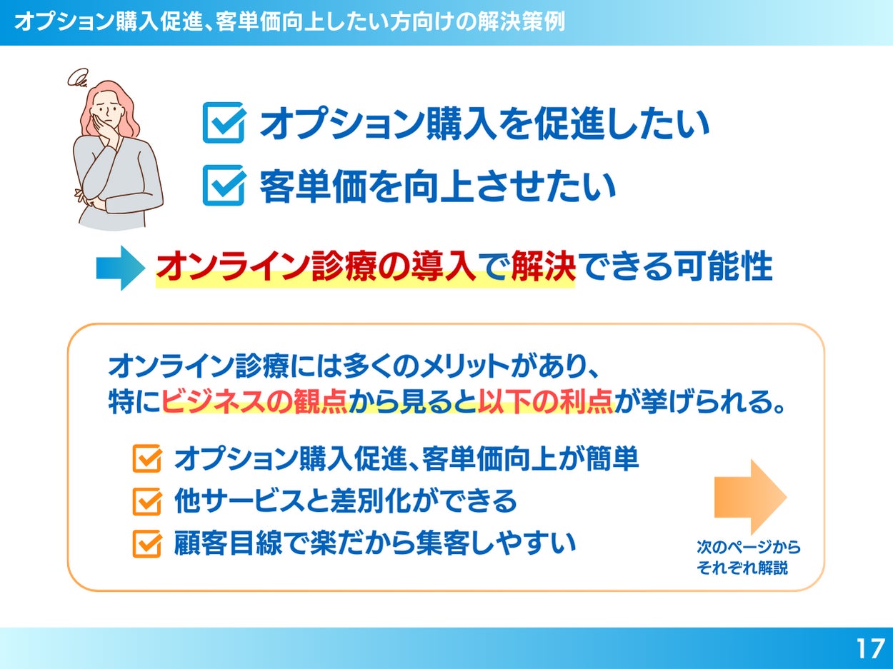 本レポートでは、オプション購入促進、客単価向上したい方向けに解決策をご紹介しています。また、オンライン診療を効率よく導入する方法についてもご理解していただくことが可能です。